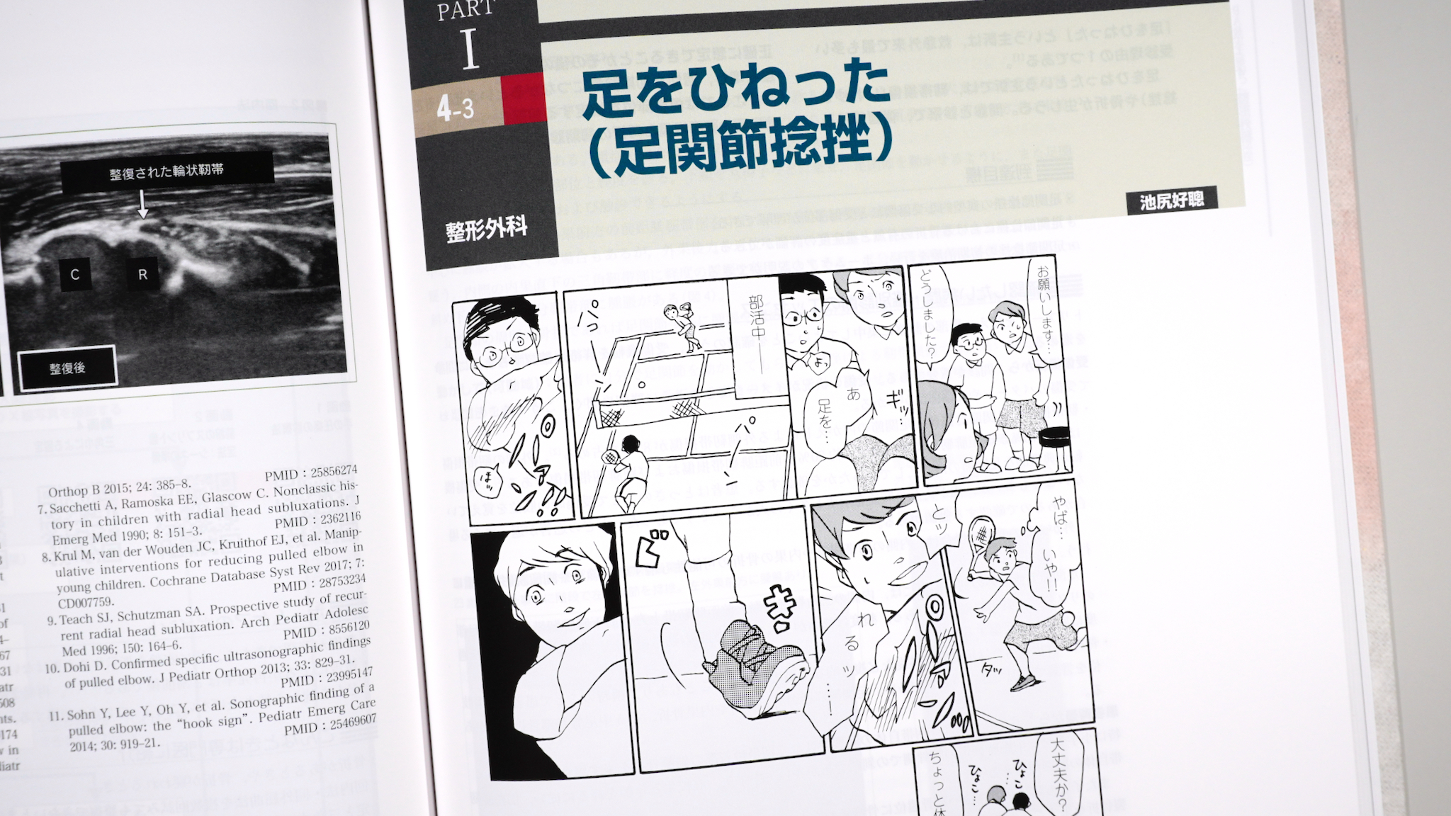 多くの扉ページには、発症や受傷のときの様子がマンガになっている。文章よりも様子がよくわかる。マンガは途中で終わっていてオチがない。本文を読めば、答えは自ずとわかる。