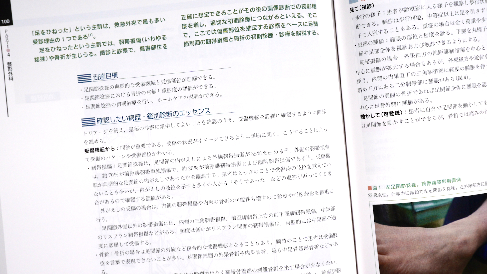 ケースをひとつみてみよう。タイトルが主訴になっている。救急に訪れるひとは、それを訴えるのであって(ここなら、足をひねった、捻挫したなど)、病名(前距腓靭帯損傷)を言ってくれるわけではないからだ。