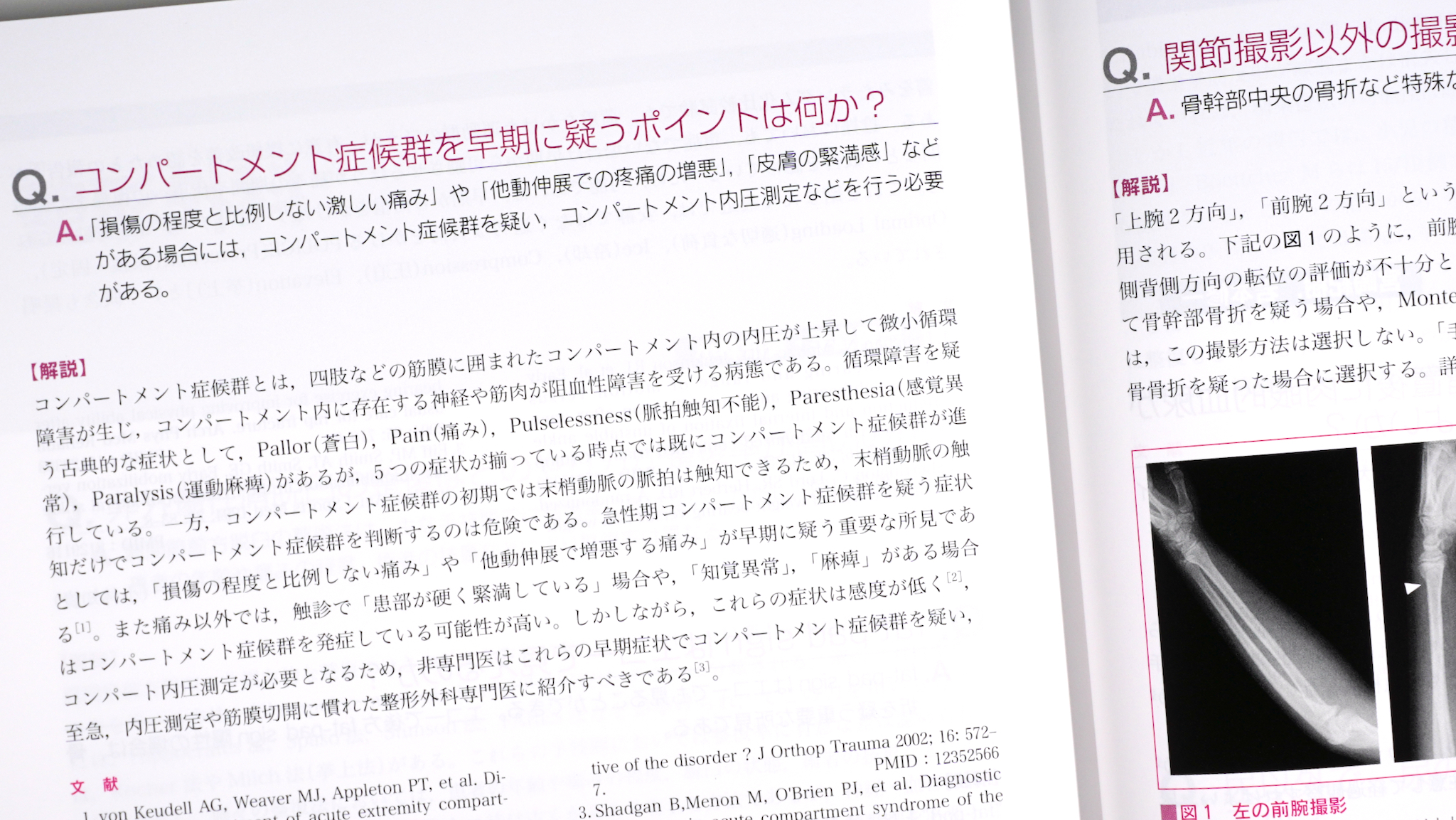 Q&Aは、ありがちな疑問の押さえ。例えば、コンパートメント症候群のことは知っていても、それを察知できなければ仕方ない。コンパートメント内圧計などふつうは手元にないので、なおさらだ。