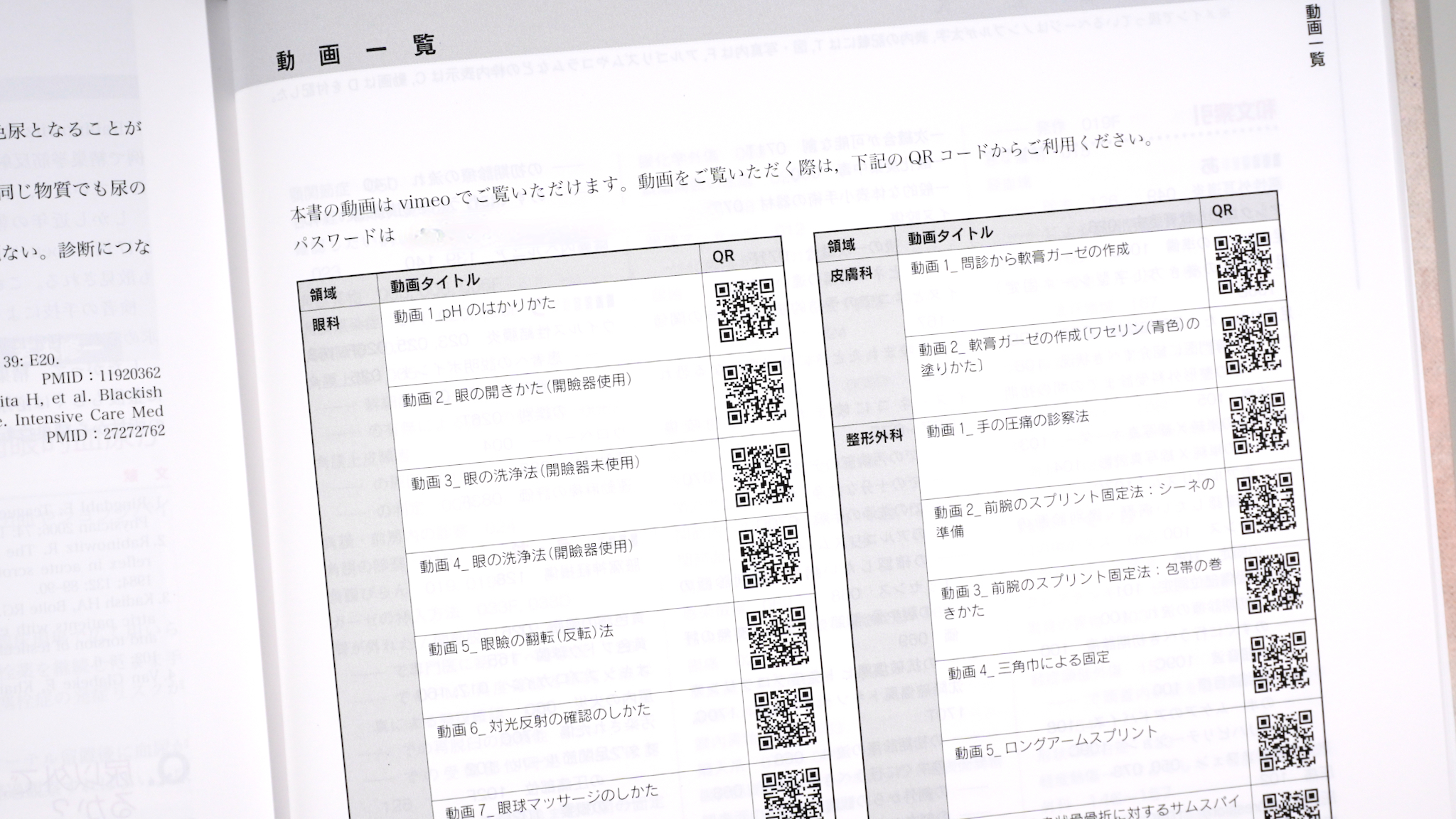 本書は具体的に、ビジュアルに制作されている。コツをつかむのが重要な手技には動画が用意されている。動画自体はVimeoに置かれているので、スマホでいつどこでもみることができる。アクセスに必要なパスワードは「動画一覧」のページにある。