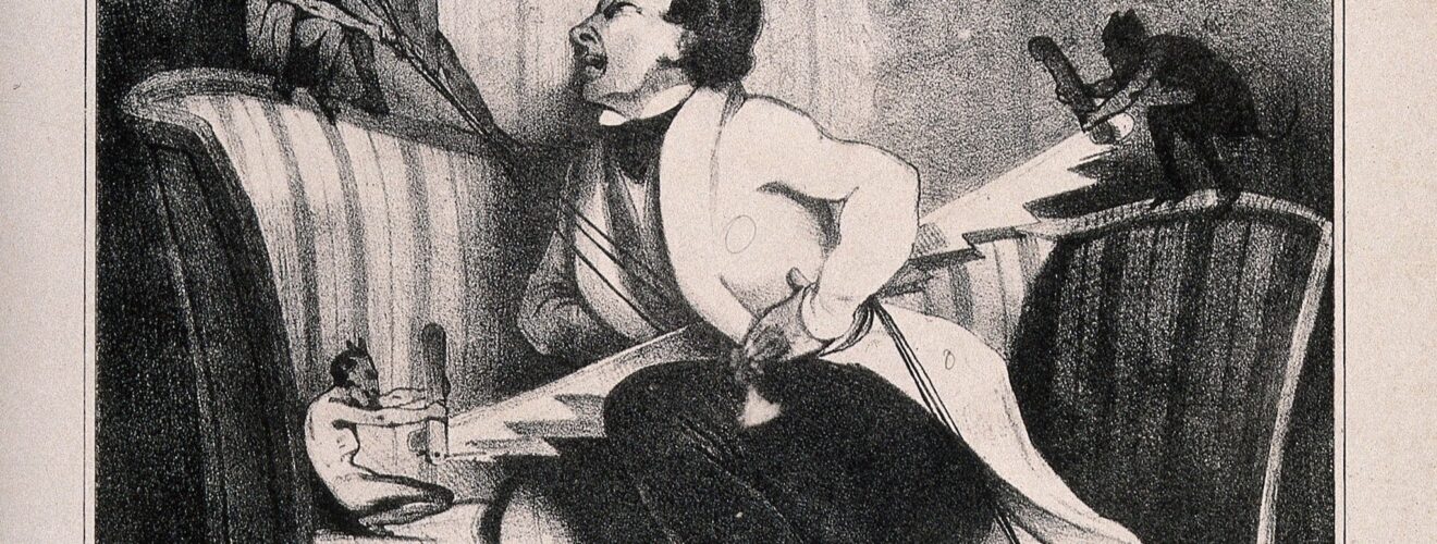 Devils saw away at a colic sufferer's abdomen. Lithograph by C. Ramelet after H. Daumier, c. 1833. Wellcome Collection. Source: Wellcome Collection.