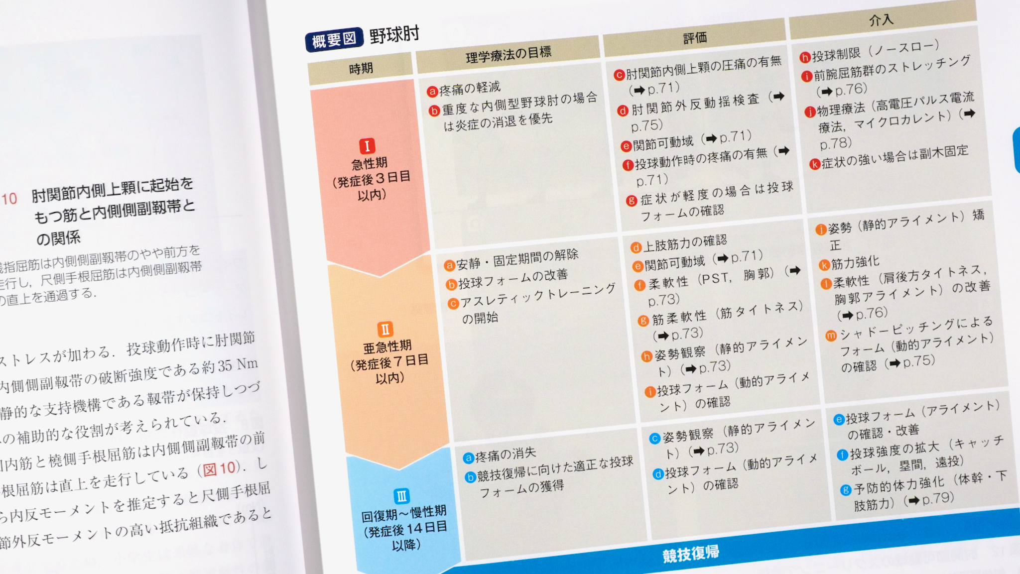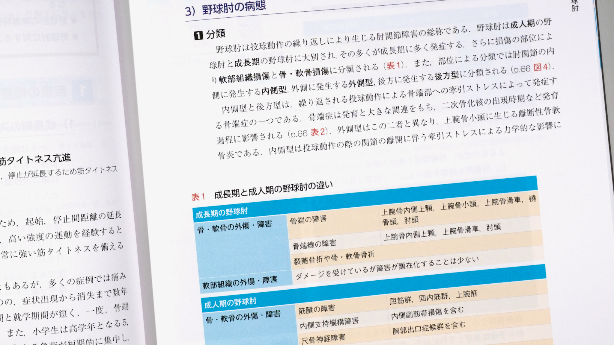 各論の肘関節の章から、「野球肘」をみてみよう。大谷翔平選手の怪我など、最近注目されるポイントだ。