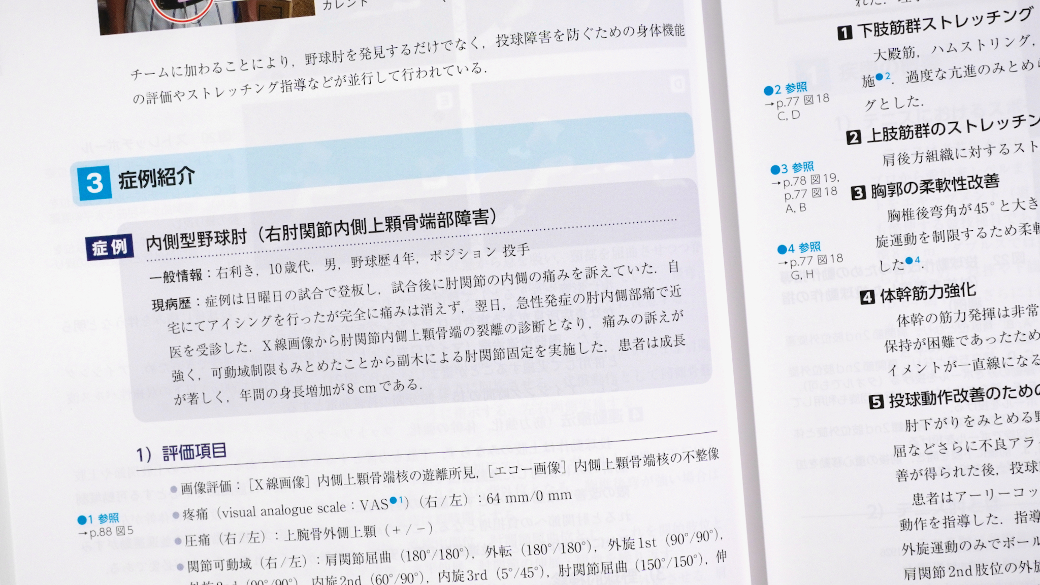 まず、野球肘がどういうものか、解剖も含め基礎から解説される。発生機序や画像診断もある。大人と子どもとで怪我の様式に違いがあることもおさえられていて、幅広い年齢層の怪我に対応できる。