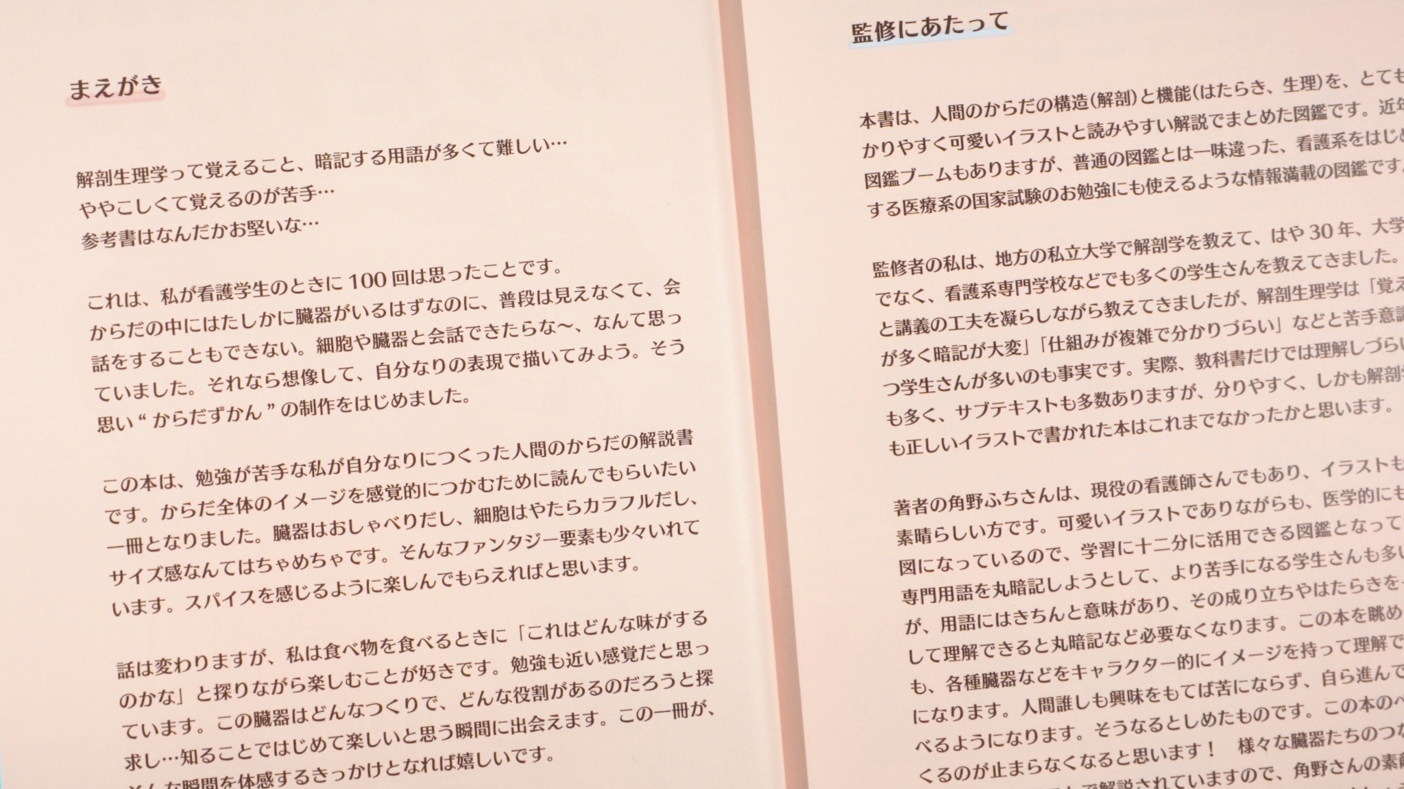 角野 ふちさんは、看護師でイラストレーター。書籍や雑誌記事にイラストを提供している。本書は、ヒトの体の仕組みを学べるサイト「からだずかん」が元になっている。角野さんが筆頭になる初めての著書だ。この本には1000点以上のイラストがあるらしい。