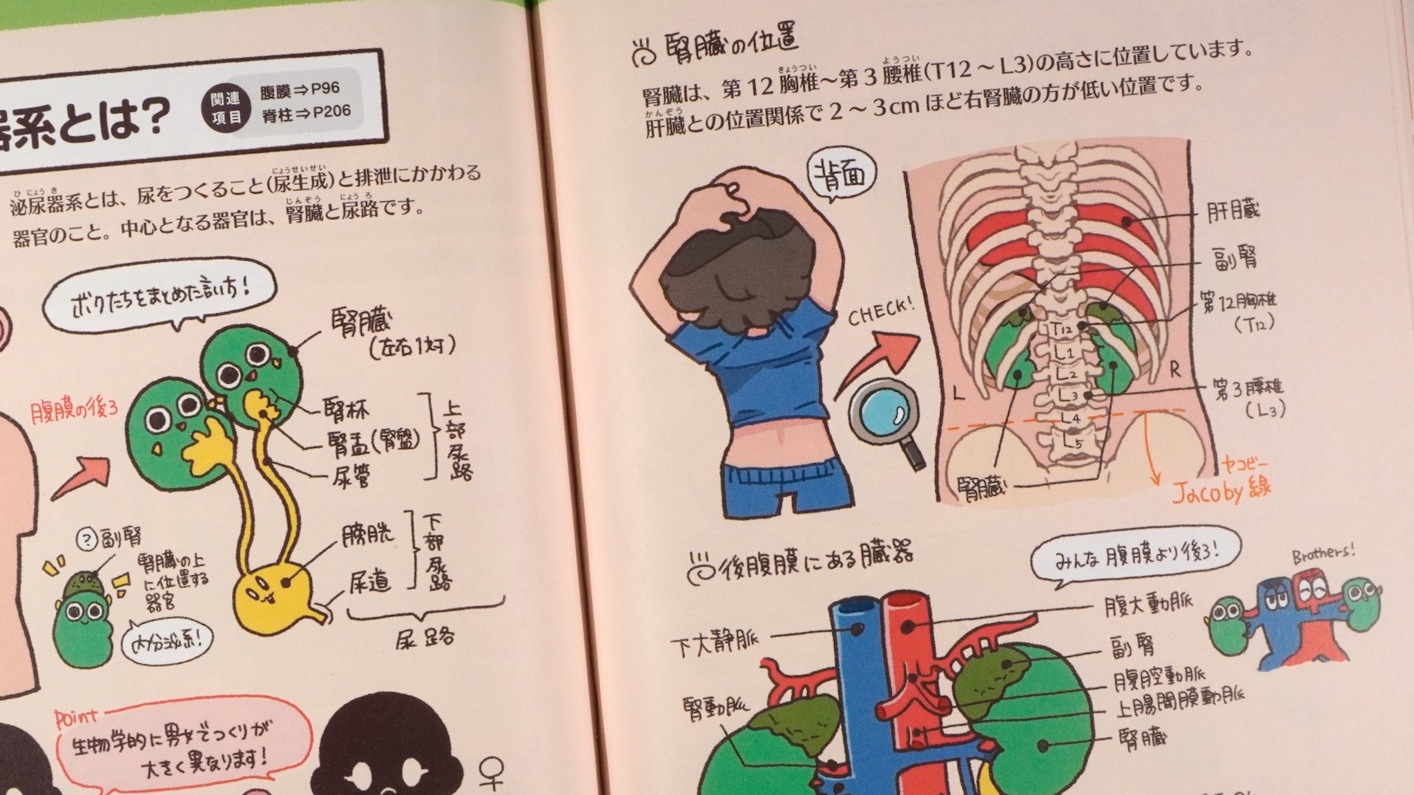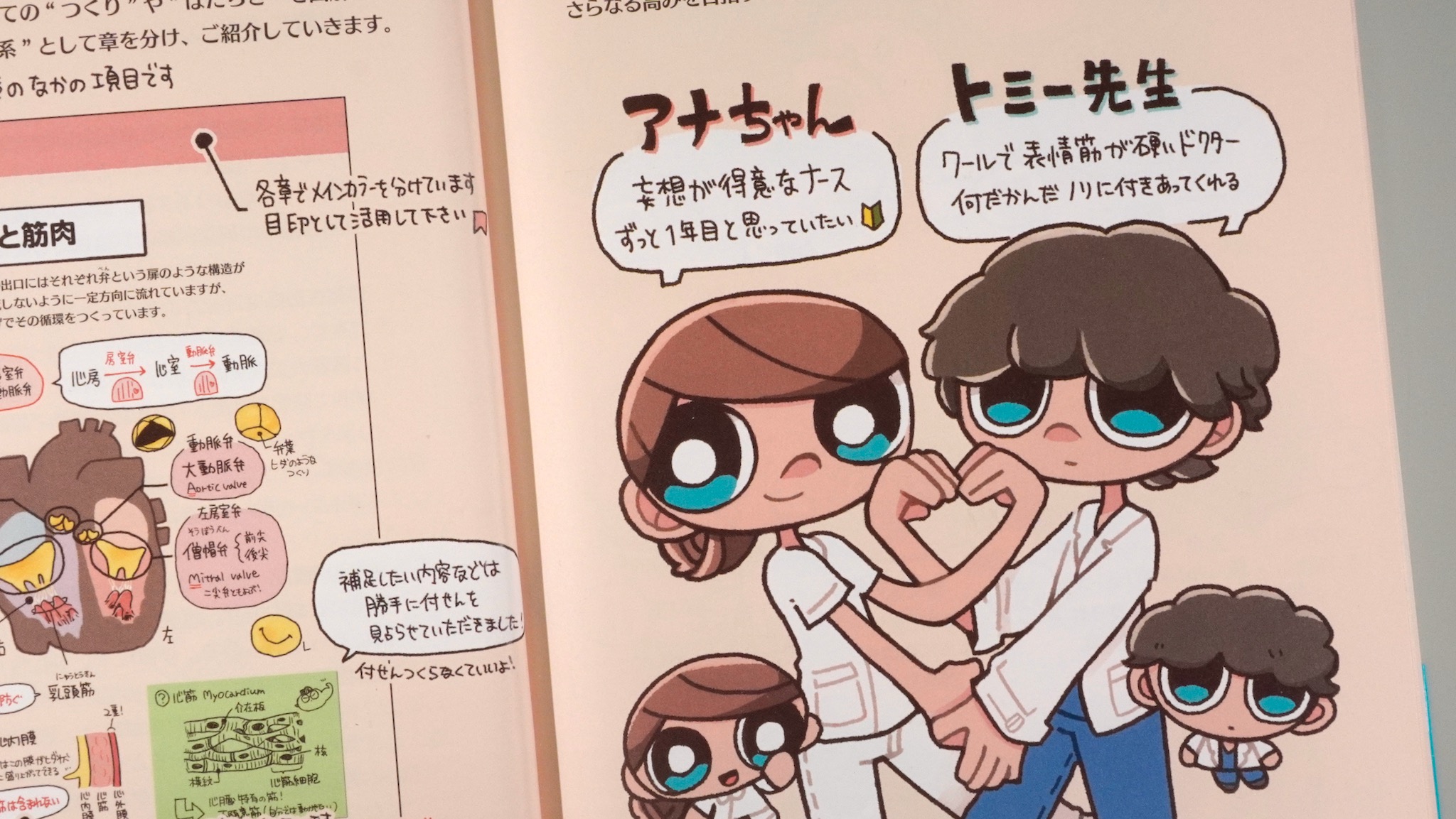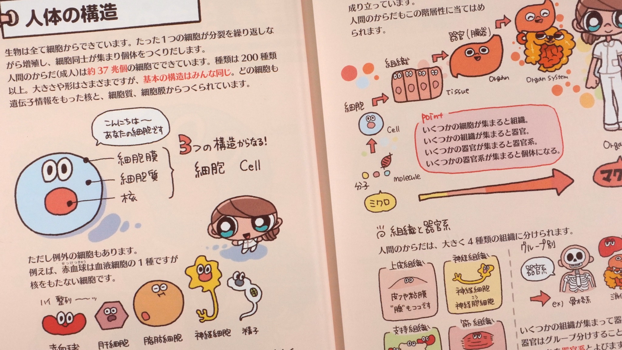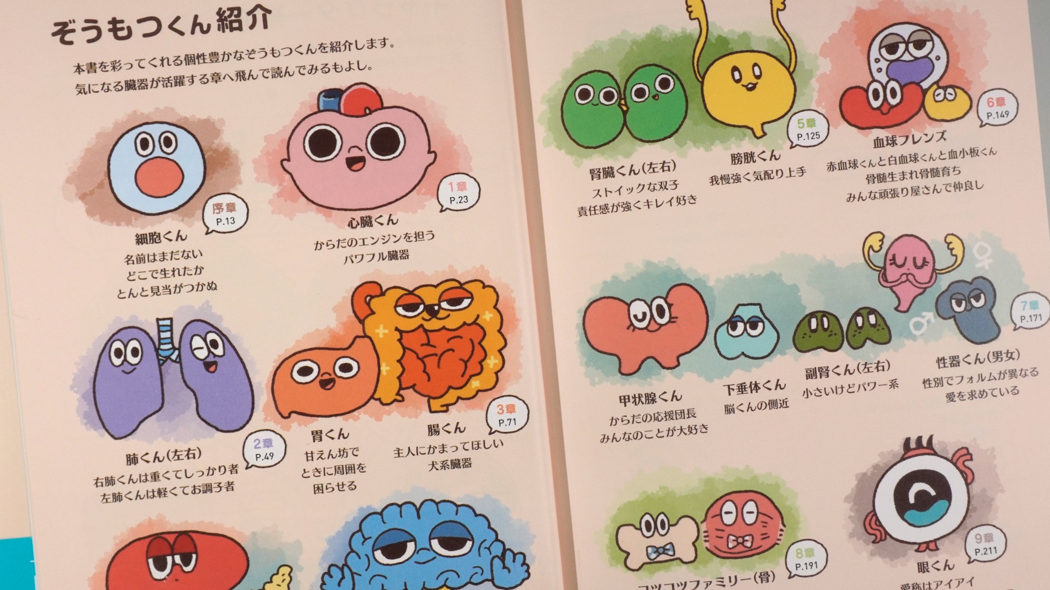細胞、組織、内臓(器官)はいずれもキャラ化されて親しみやすい。一方で、形の正しさを要するところでは、いい感じに正しく描かれている。