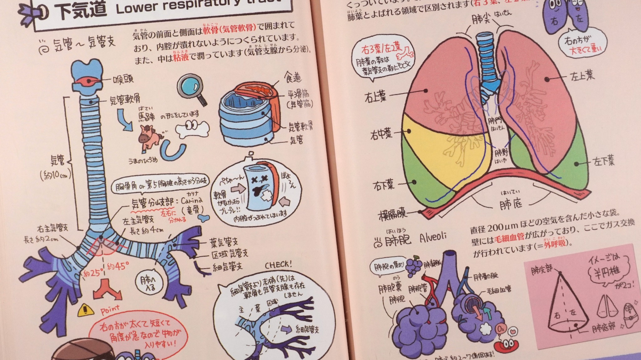 気管支の分岐の左右差や、肺の分葉など、臨床で重要なこともちゃんと言及されている(気管支に描き込まれた角度が、分度器で測るとだいぶずれているけれども)。