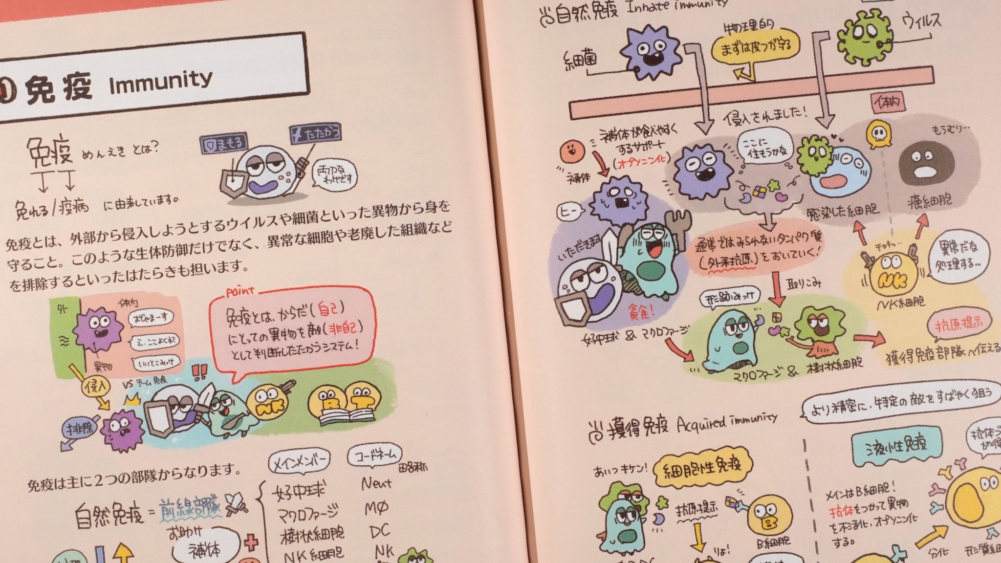 ただし、見開きのシバリがキツい部分もちょっとはある。免疫の概要のあたりは、かなり盛りだくさんでお腹いっぱいだ。しかしもしお腹いっぱいでも、もうちょっと知りたければ、本書をきっかけに、マジな方のテキストを見たらいい。