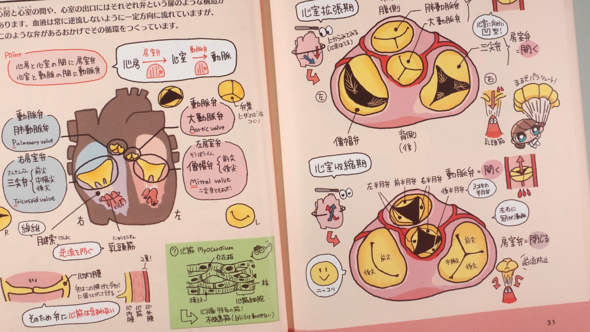 それなりの正確さがよいというのは例えば、乳頭筋と腱索のはたらきの説明。これらがパラシュートで描かれていて、これらがどう働いているのかをみてとれ、とてもわかりやすい。