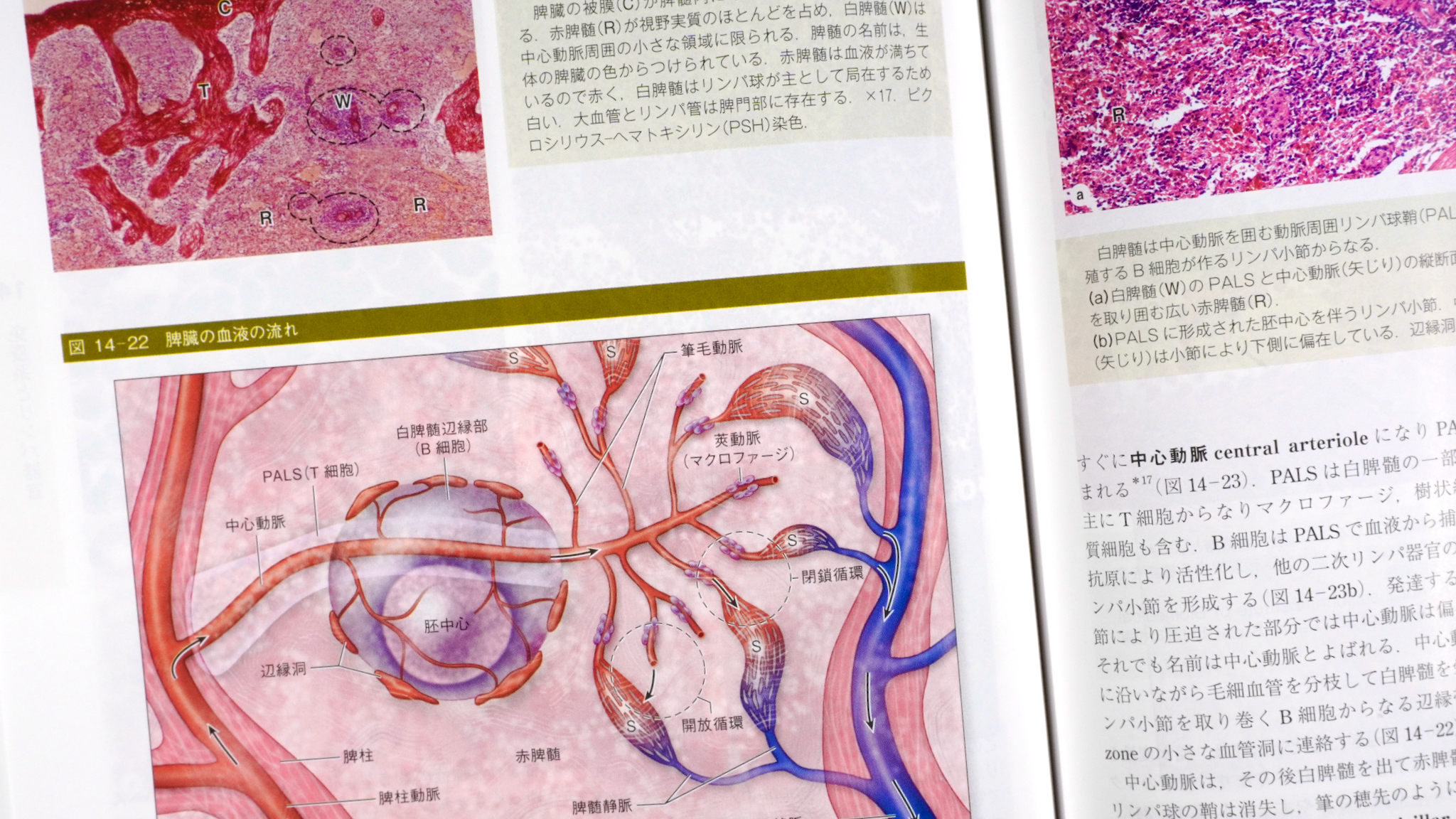 1つの事柄が、光学顕微鏡写真、電子顕微鏡写真、イラストを使って説明される。脾臓の成り立ちなど、組織学実習で光学顕微鏡を覗いただけでは何が何だか、形の意義がサッパリわからないことは少なくない。ここに電子顕微鏡写真や模式図があれば、組織の読み取りができるようになってくるだろう。