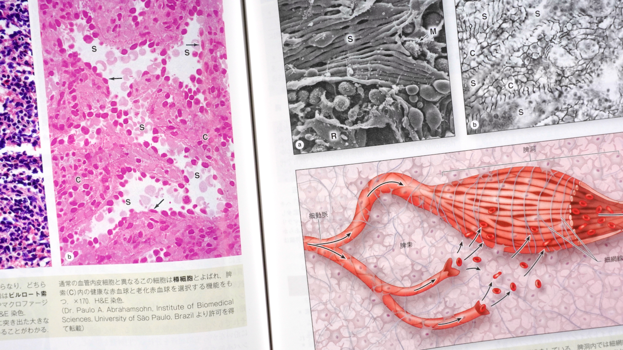 脾臓の類洞の成り立ちが、光学顕微鏡写真、電子顕微鏡写真、イラストで説明される