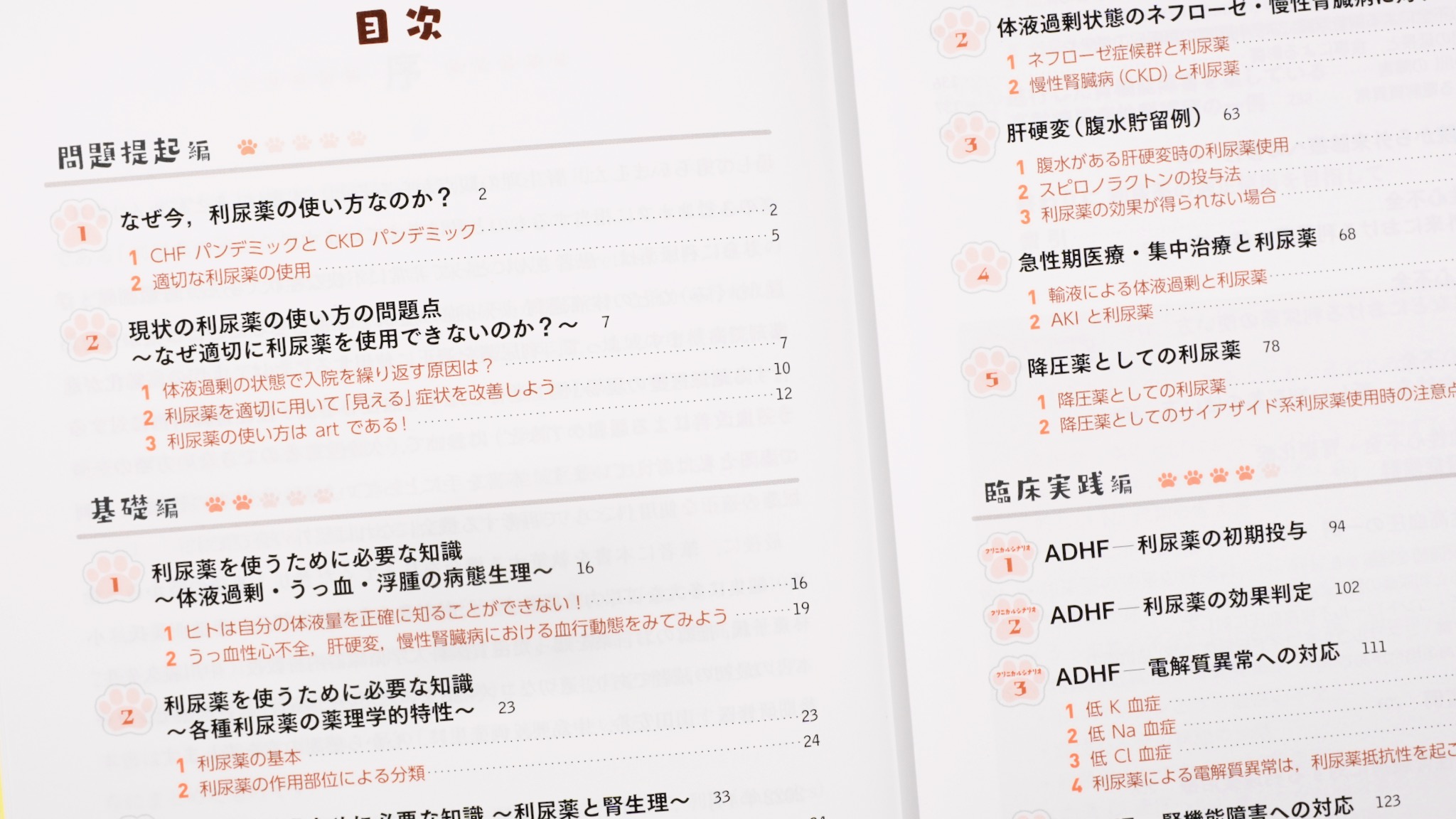 臨床は「臨床基礎編」と「臨床実践編」に分かれる。「臨床基礎編」では、代表的な病態に対する利尿薬の使い分け・使い方をまとめる。