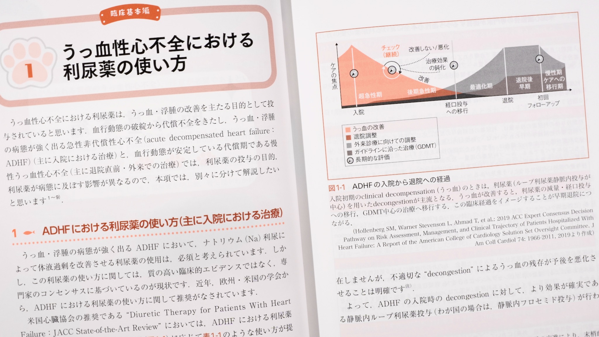 患者が急性心不全になり、幸いそれを持ちこたえても慢性心不全として日々をやりすごす。ときどきそれが悪化して入退院を繰り返す。そのたびに全身的に悪化していき、死に至る。こうした急性増悪を防ぐことが重要で、利尿薬の使い方がそのカギだと、筆者はいう。