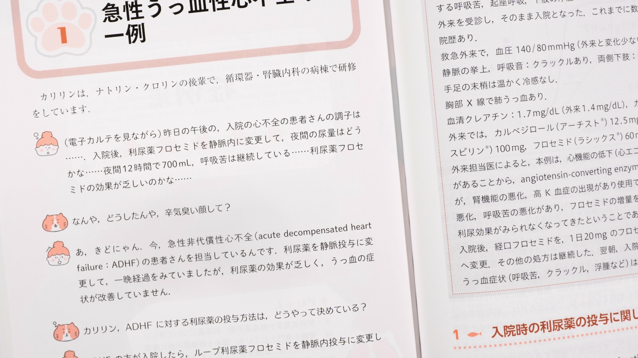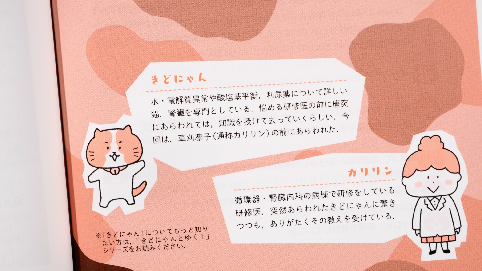 「症例編」は、会話形式で症例を、病気の経過に沿って検討していく。登場するのは、腎臓専門医の「きどにゃん」と、研修医の「カリリン」。きどにゃんはかわいい外観に反して、関西弁のオラオラなやつ。カリリンは、サザエさんみたいなヘアスタイルにシャツのボタンをしっかり留めてプリーツスカートという、この辺では見かけない若者。