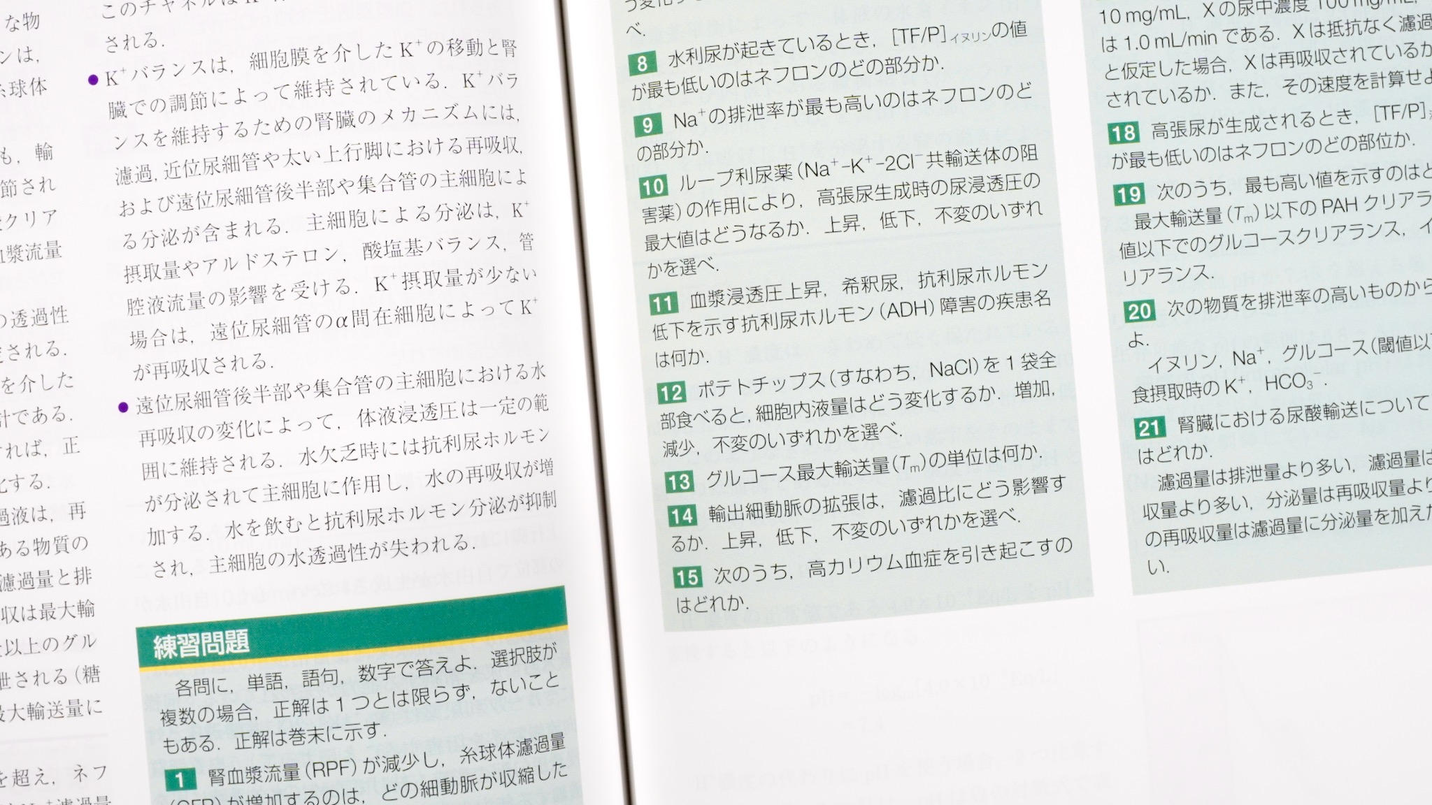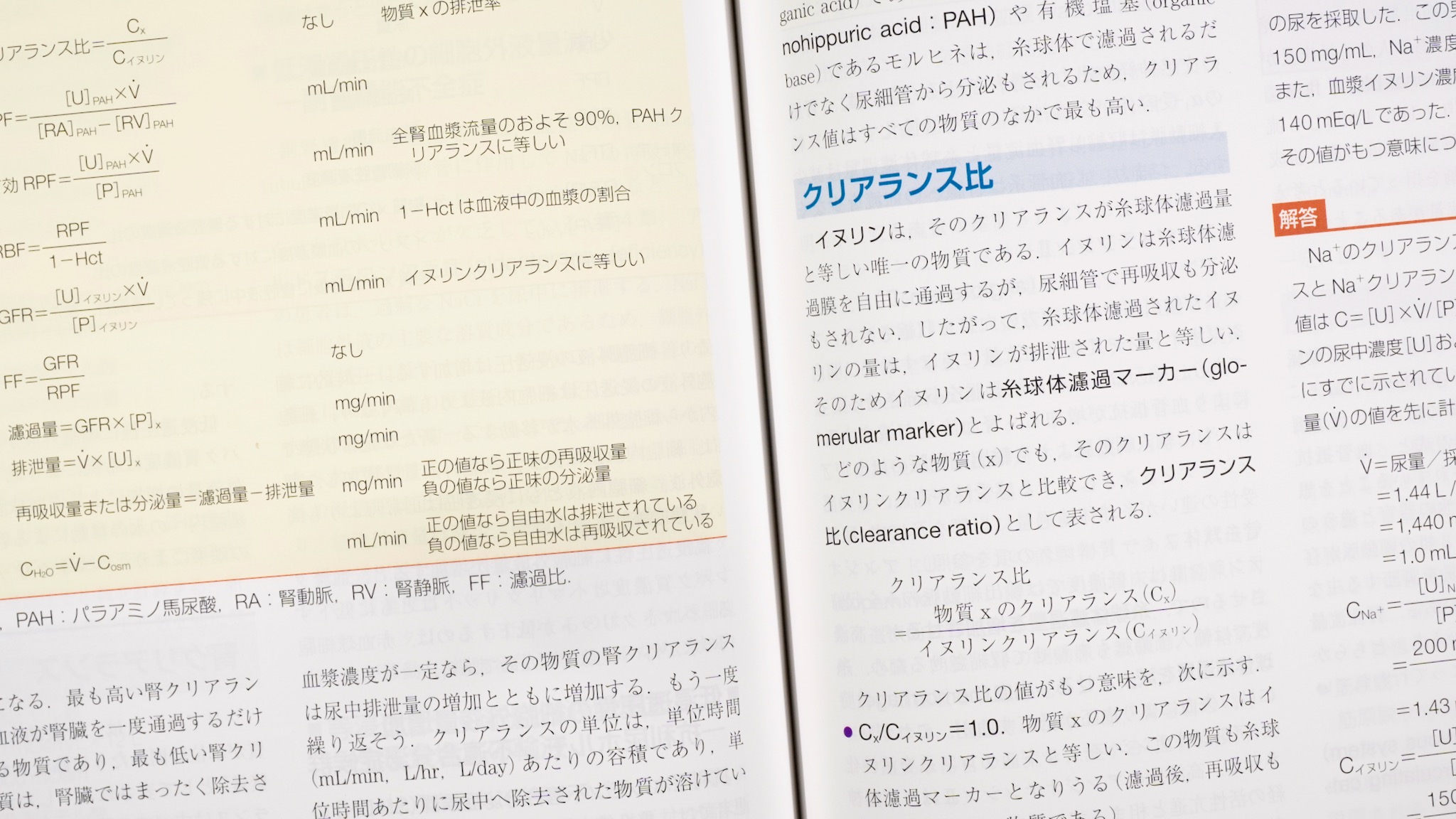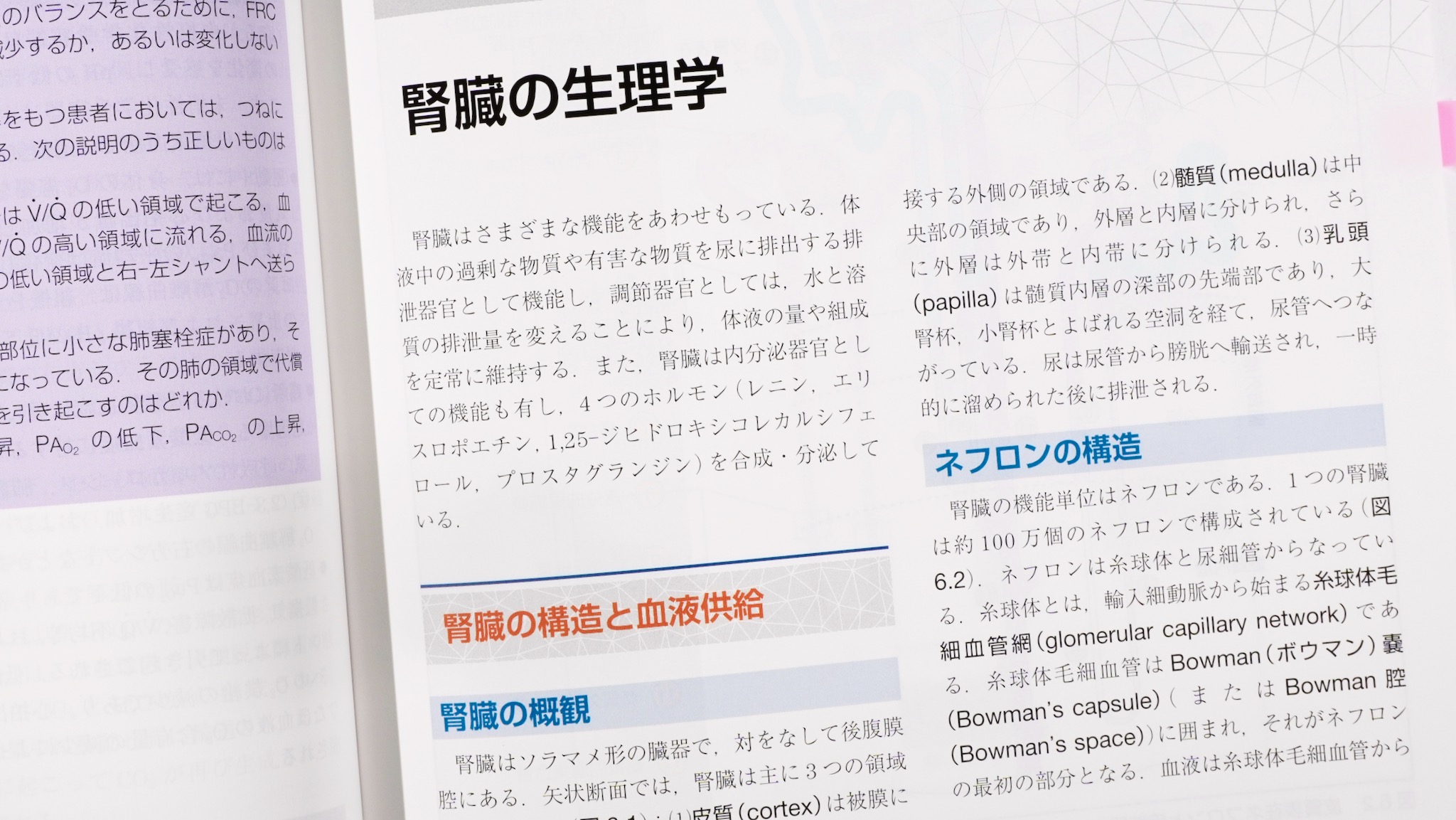 『コスタンゾ』で充実しているのが、臓器の生理学だ。「おはなし」で機能を説明するだけではなく、数式をたくさん使って、定量的に理解していく。しかも、ただ数式を羅列するのではなく、その意味づけを文章で説明し、ときには例題も使う。授業でこうした数式の計算が多く出てくるなら、本書は好適だ。また、臨床のいろいろな病態の理解にも重要になる。