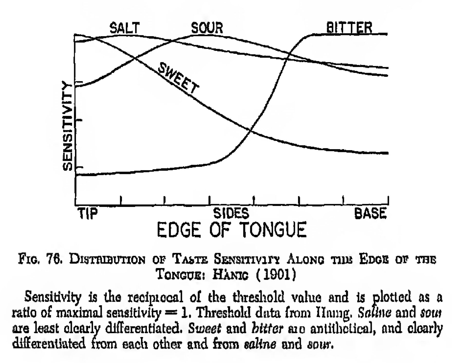 味覚地図の都市伝説のきっかけになった、エドウィン・G・ボーリングによる誇張されたグラフ(Internet Archiveより)。軸に単位のないのが怪しげだ