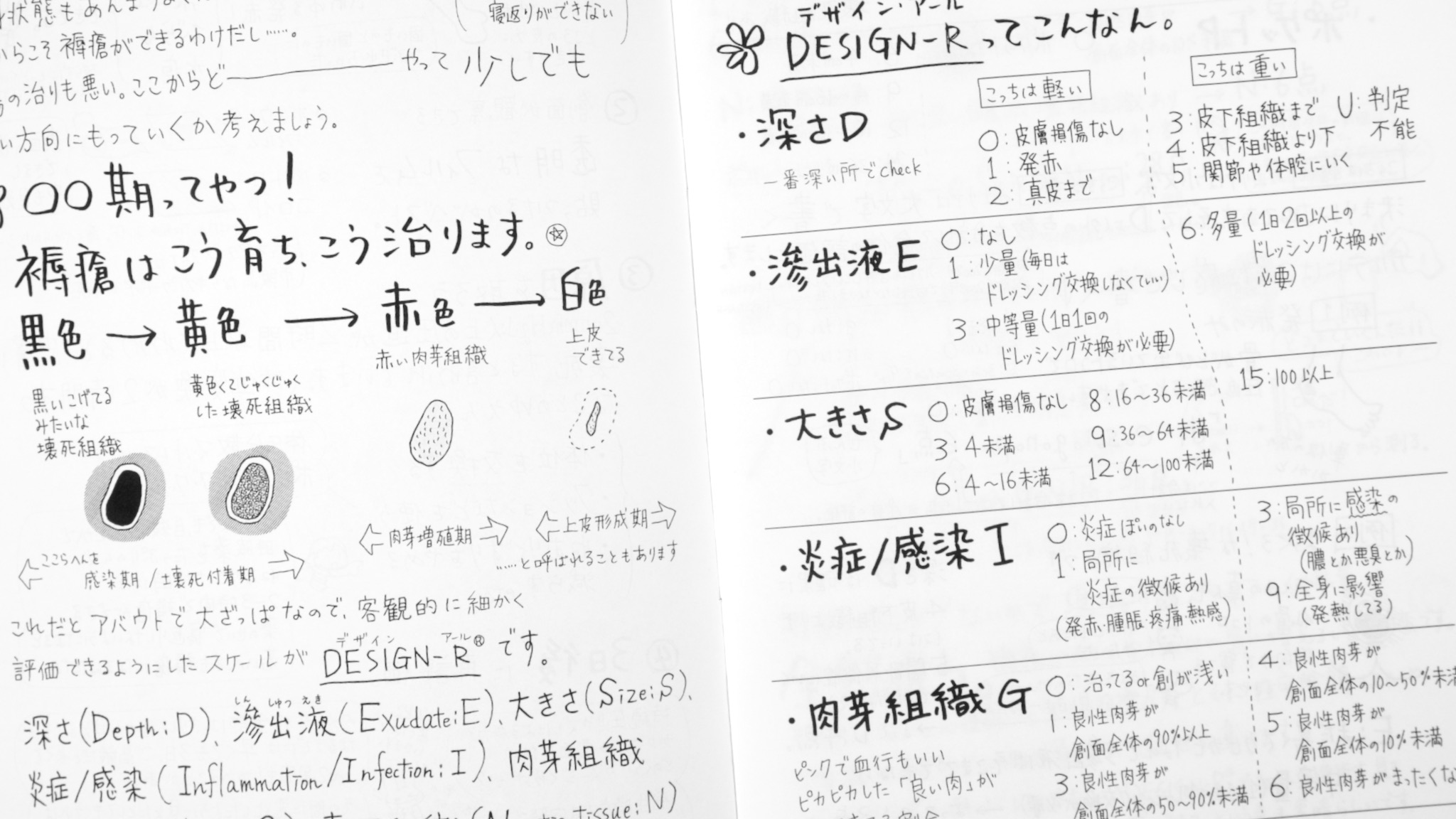 そこで大切になってくるのが、定量的評価だ。DESIGN-R®という。日本褥瘡学会学術教育委員会が開発した。商標登録されている。上のリンク先に、評価シートと練習問題がある。やってみよう。