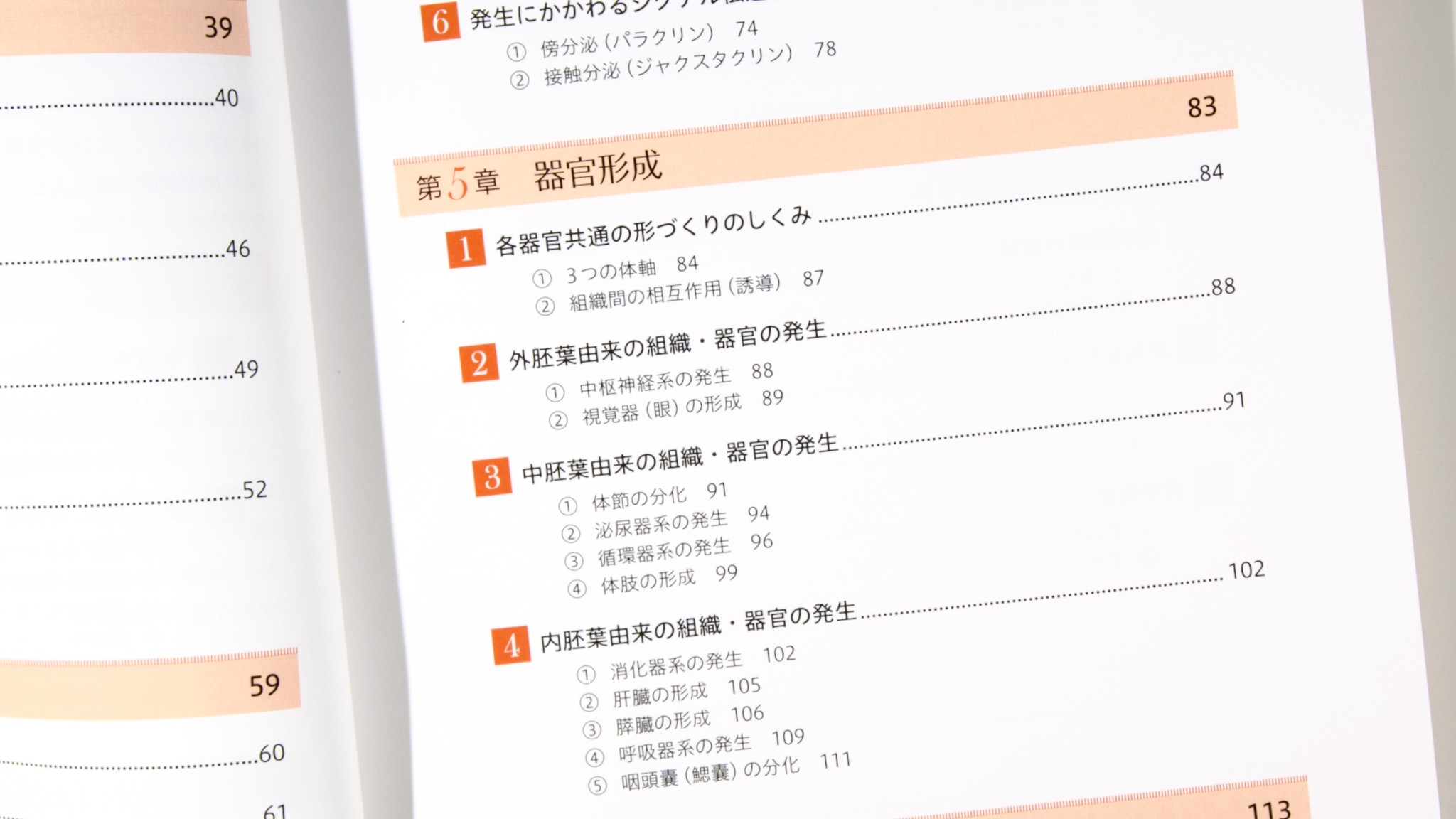 器官形成は、発生生物学に基づいて概説される。ひとつの系統がひとつ、ふたつの図で説明されている。本格的な人体発生学で1章使うくらいの内容なので、概説の度合いは推し量れよう。心房の中隔形成でいえば、一次中隔、二次中隔、一次孔、二次孔、卵円孔と、いろいろと詳しい話をしないと中隔ができあがらない(つまり試験問題にならない)が、そういう話はでてこない。胃や中腸の回転もおおまかな図だけだ。一方で、心臓が肝臓を誘導するといった、発生生物学の知見が押さえられている。