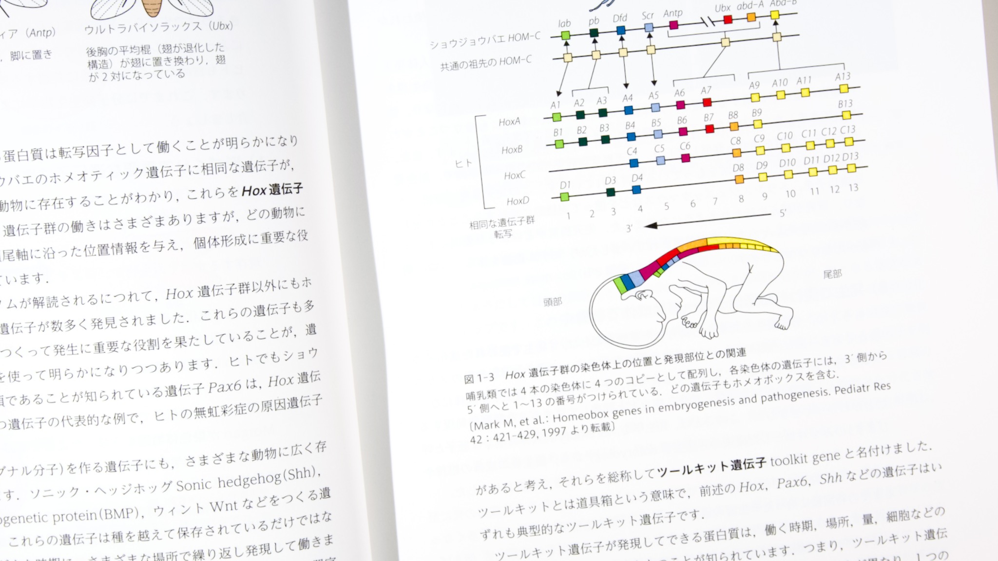 本は発生生物学の基本から始まる。たとえば、ツールキット遺伝子、つまり、Hox、ソニック、ウイントなど、形態形成の基盤になる分子が押さえられている。発生のいろいろな場面でこれらが使われるので、最初に馴染みになっておくと、後でいろいろラクなのだ。