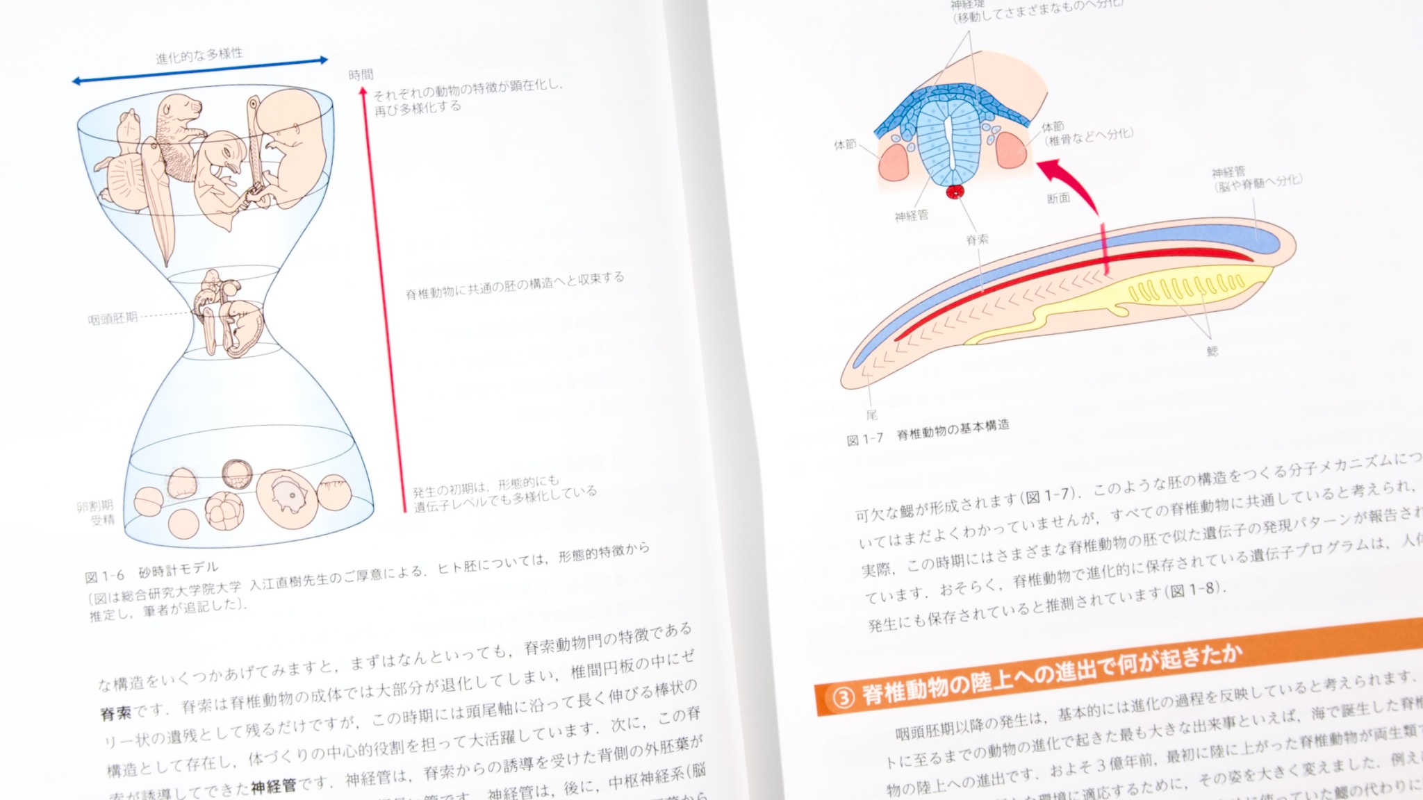 ヘッケルからベーアにかけての系統発生学が概説され、砂時計モデルで発生現象の相同性と分化がわかるようになっている。(反復説はちゃんと否定されている。)脊索動物から脊椎動物にかけてのボディープランの進化は、ヒトの体の成り立ちを理解するのに重要だ。『グレイ解剖学』にもでてくる。このあたりは発生生物学の伝統が踏襲されている。