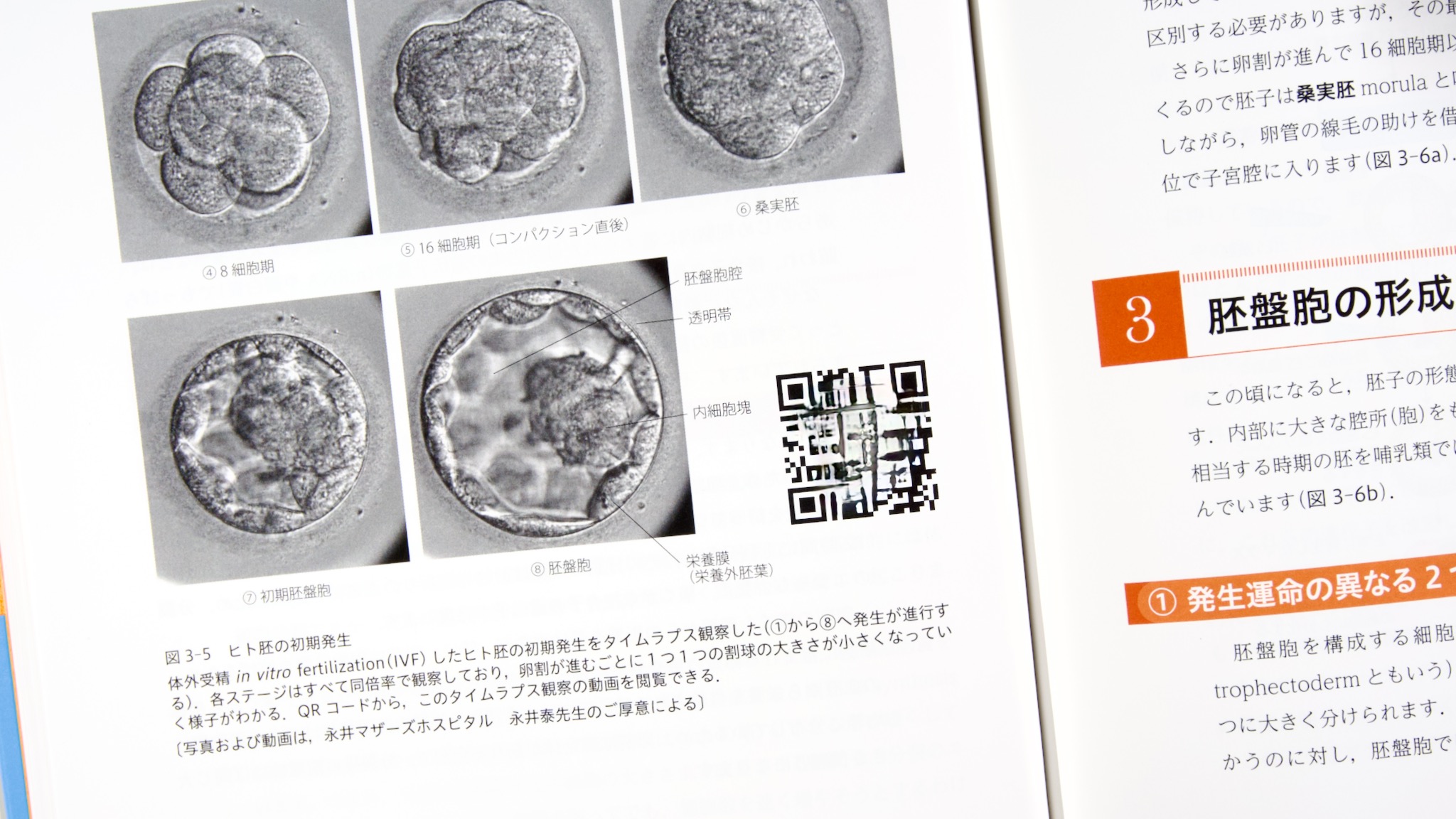 イラストはどれも明解で美しく、正しい。イラストだけでなく写真もある。ヒト胚の接合子から胞胚にかけての顕微鏡写真が、貴重だ。QRコードを読み込むと、その映像が動画で見られる。