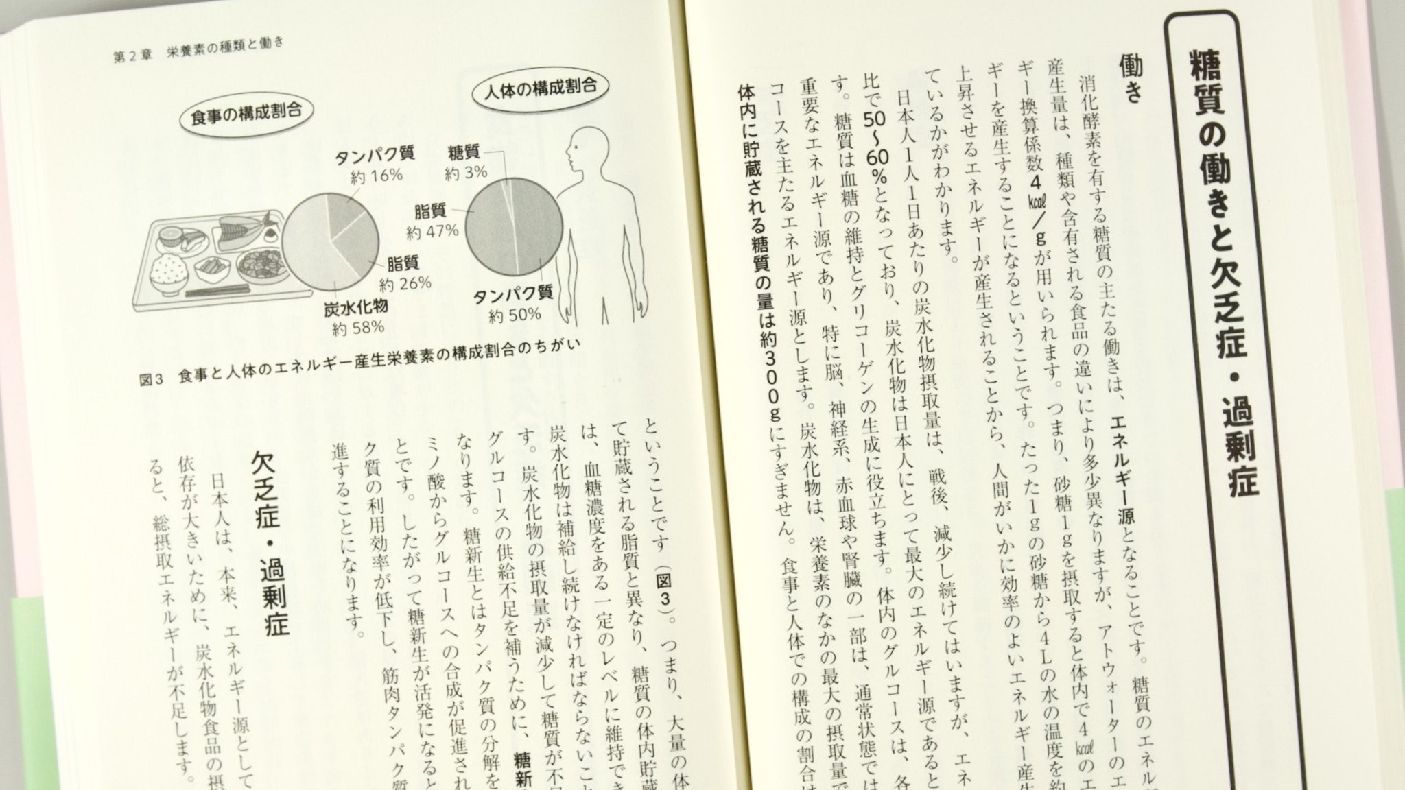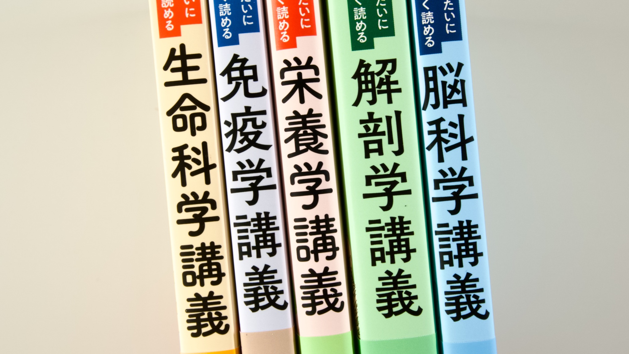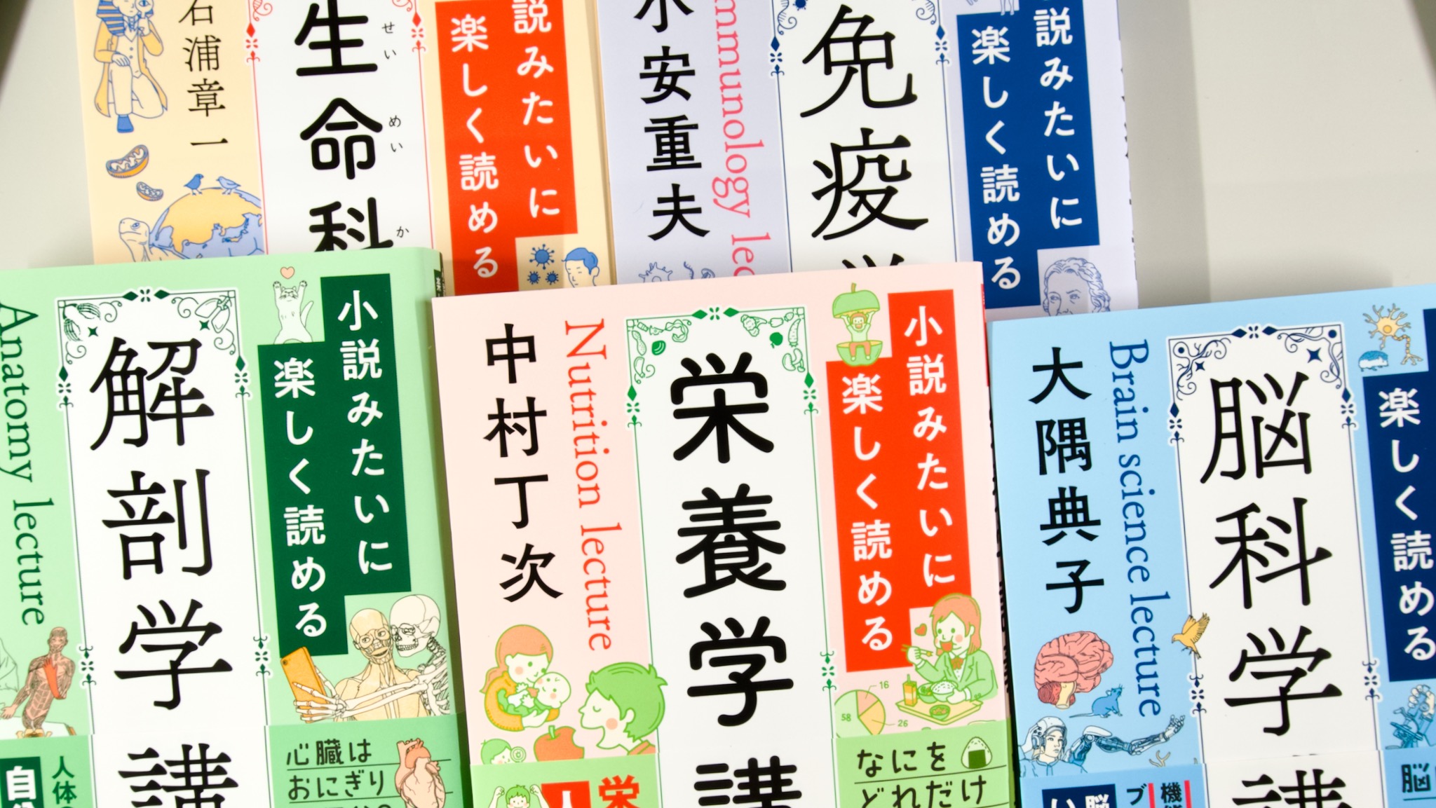さて本書『栄養学講義』は、「小説みたいに楽しく読める」シリーズの5冊目だ。著者は栄養学の重鎮。前著『楽しくわかる栄養学』をリブランドし、文体を常体から敬体に変え、改訂した。本文はクリーム色の用紙に縦書きで、小説の本のように仕立てられている。カバーデザインが他と揃えられ、棚にいっしょに並べると、いっそう存在感が増す。カバーのフォントから、易しめの本だと想像できる。(このシリーズでは、易しめの本に丸ゴシック、難しめの本に明朝・角ゴシックが使われている。)