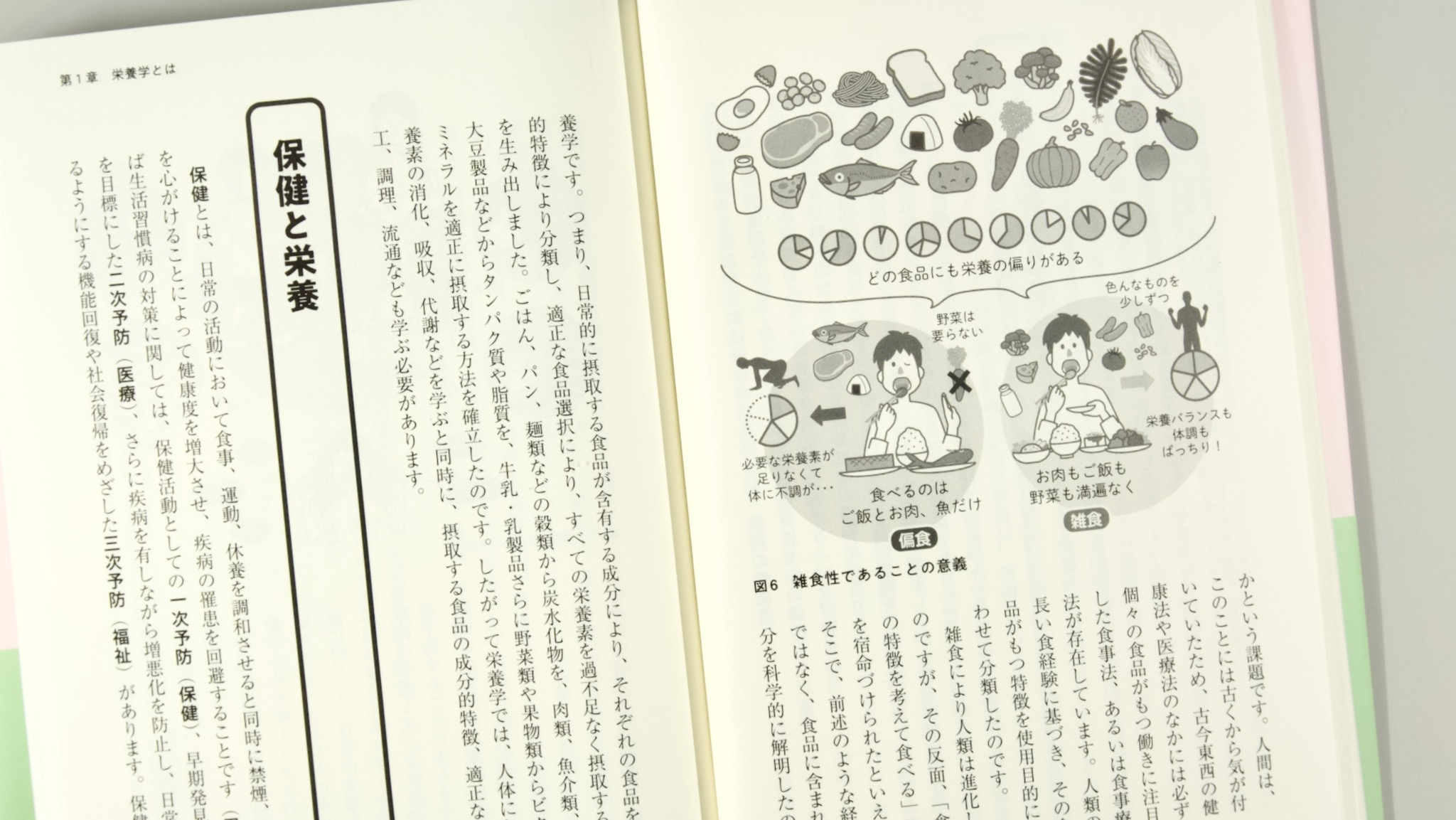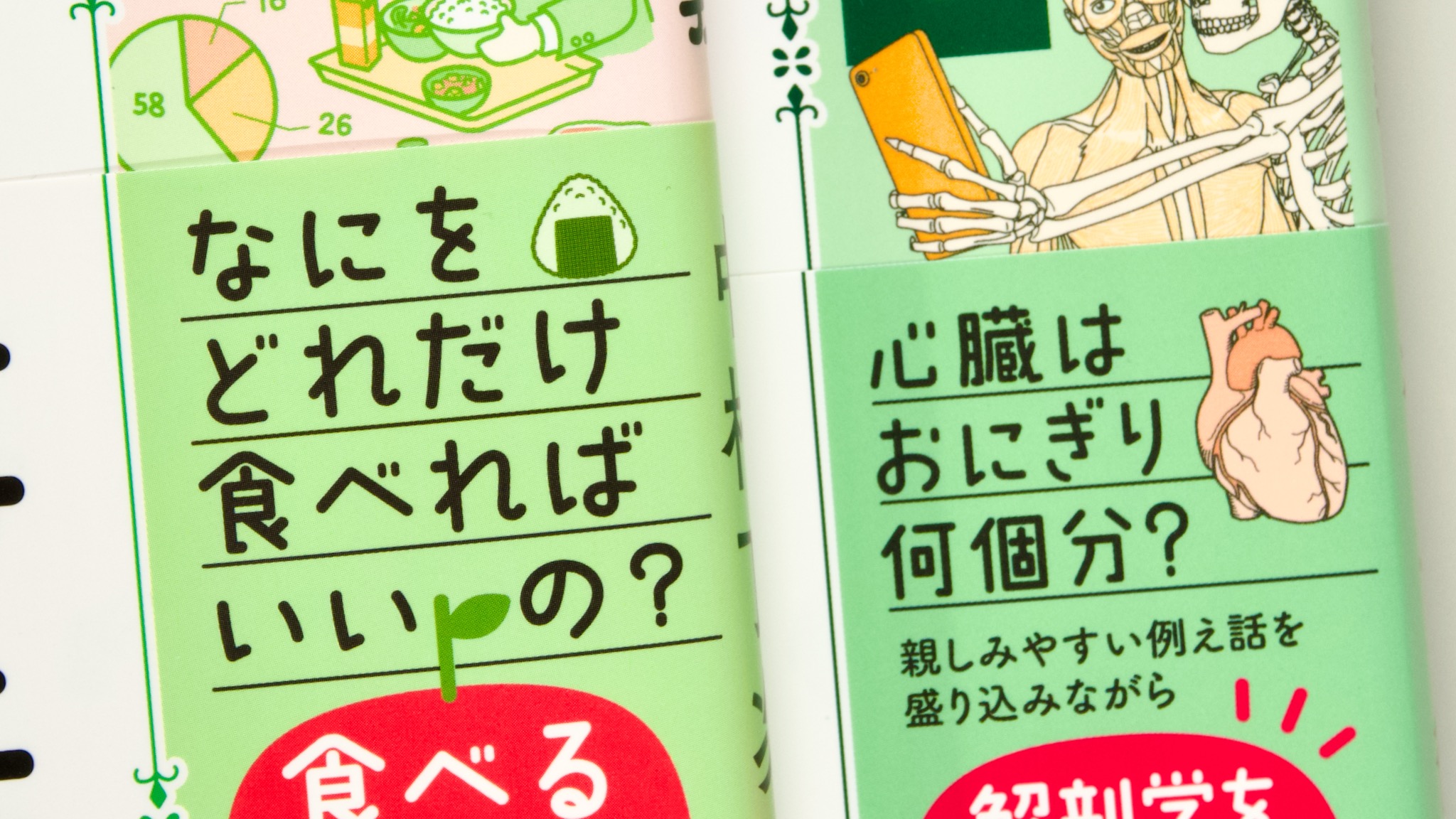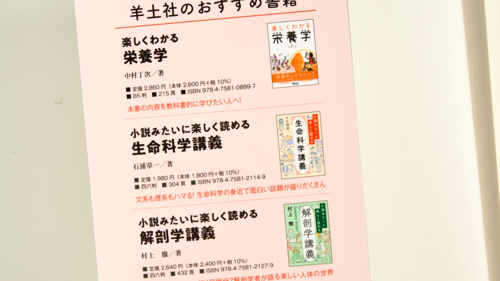 さて本書『栄養学講義』は、「小説みたいに楽しく読める」シリーズの5冊目だ。著者は栄養学の重鎮。前著『楽しくわかる栄養学』をリブランドし、文体を常体から敬体に変え、改訂した。本文はクリーム色の用紙に縦書きで、小説の本のように仕立てられている。カバーデザインが他と揃えられ、棚にいっしょに並べると、いっそう存在感が増す。カバーのフォントから、易しめの本だと想像できる。(このシリーズでは、易しめの本に丸ゴシック、難しめの本に明朝・角ゴシックが使われている。)