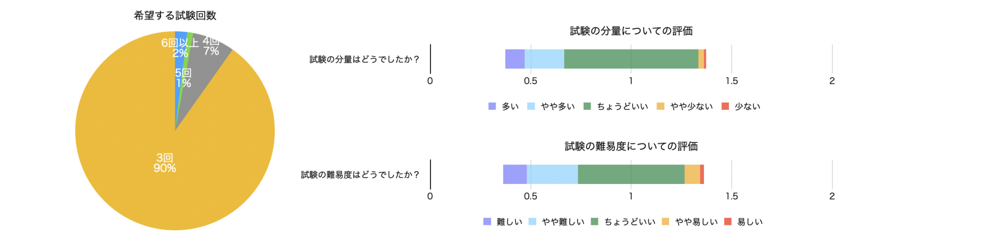 試験は3回がよいようだ。試験は多少多め、難しめだったが、知識の習得を促すにはちょうどよいと思われる。
