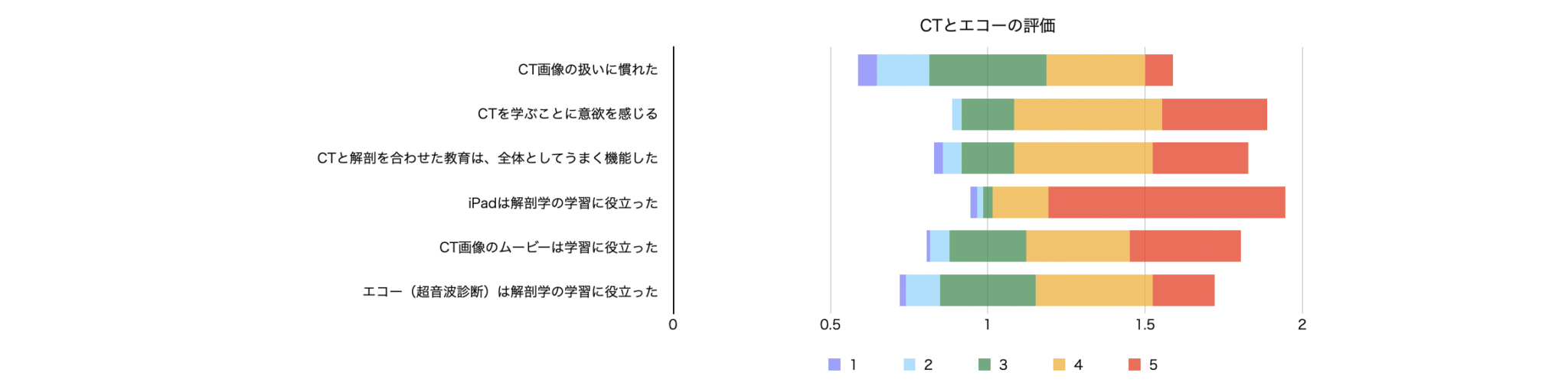 本学では解剖学実習にCTやエコーが取り入れられている。おおむね高評価が得られた。習得には改善の余地があるが、授業時間の制限もあり以降の学年も含めた学習も視野に入れたい。iPadはよく役立てられていた。