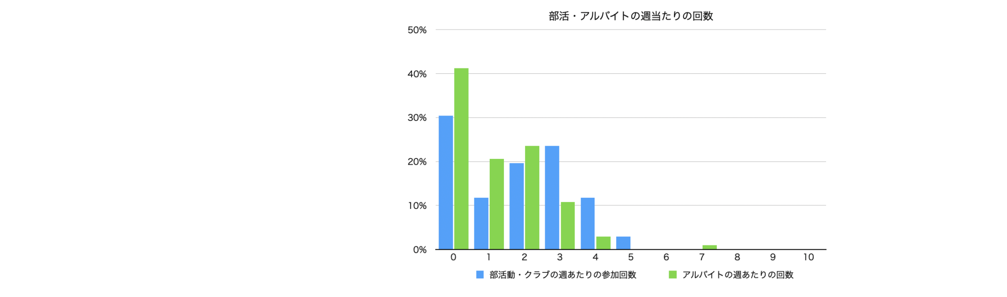 多くのひとが週当たり1〜数回の部活やアルバイトに励んでいた。ゼロのひとも多い。
