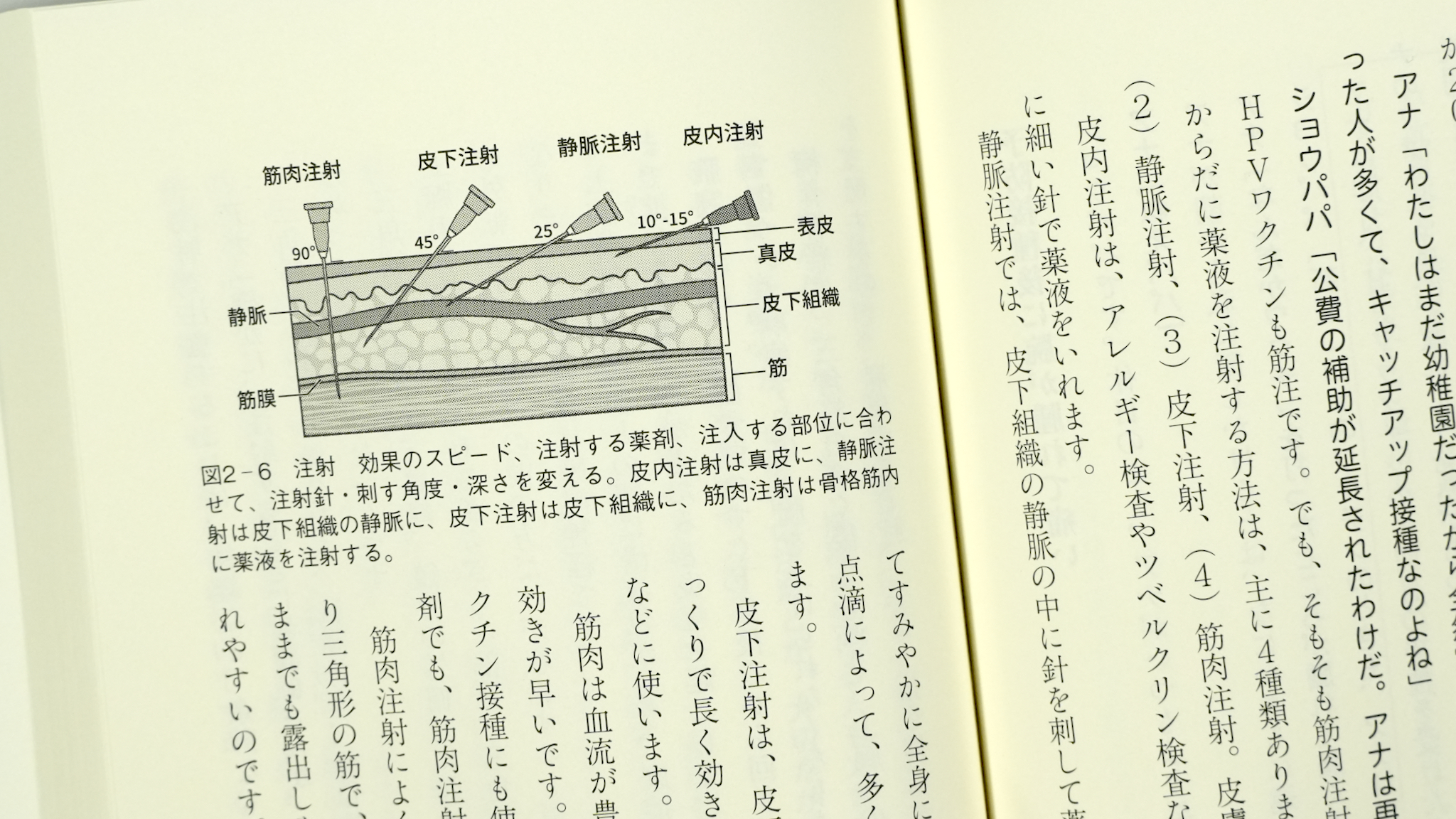 冊子体にはクリーム色の平滑な用紙が使われ、テルモの23Gと27Gの注射針のイラストもクッキリ再現されている。