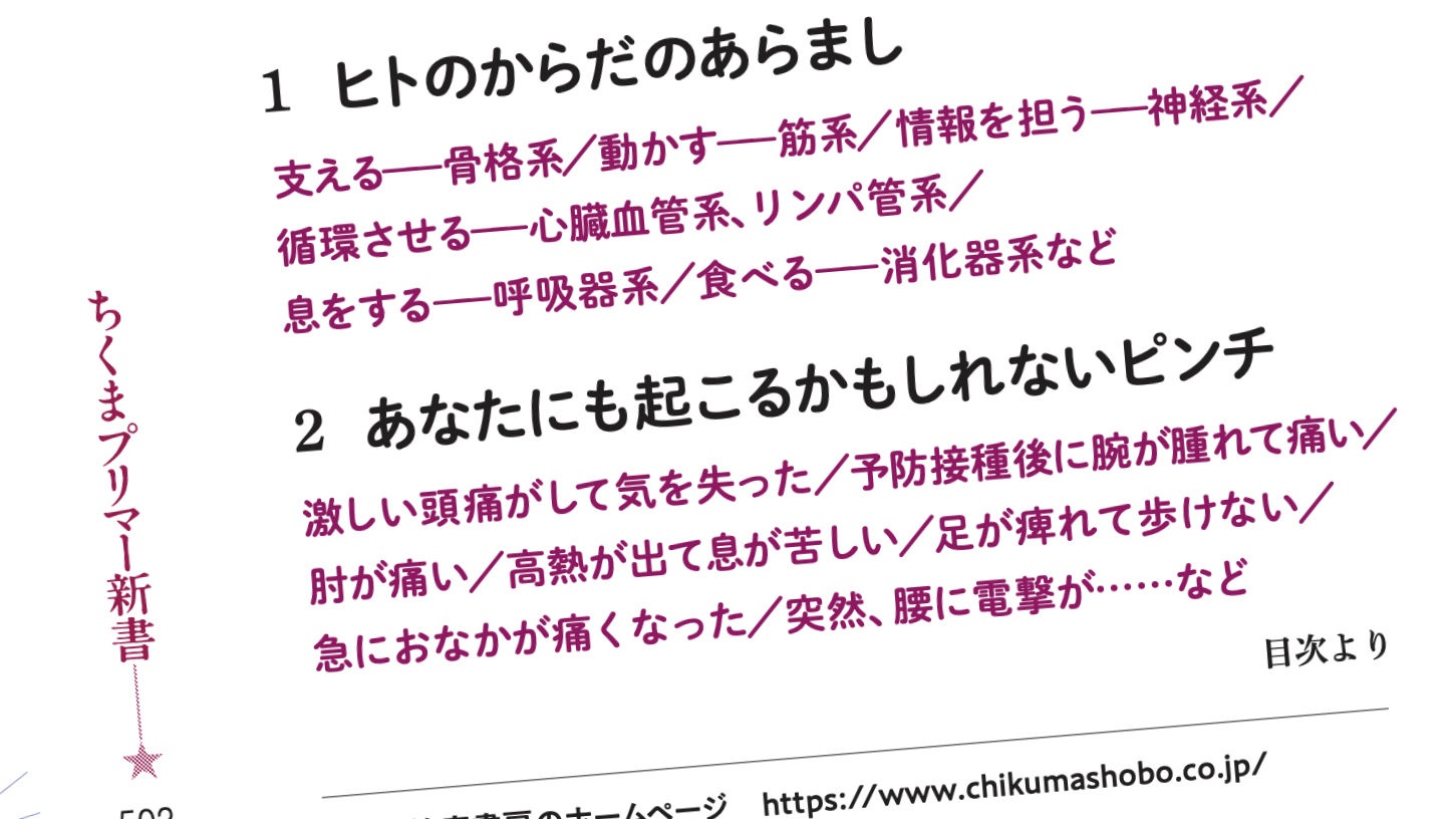 鼻血、頭痛、親指の腱鞘炎、肩や胸の痛み、急な腹痛や腰痛など、日常生活で誰もが耳にするような「からだのピンチ」から、高校生や大学生くらいの読者に起こりそうなのをとりあげた。これらを、解剖学に基づいて解読していく。ガイドラインやエビデンスへの参照も適宜入れた。