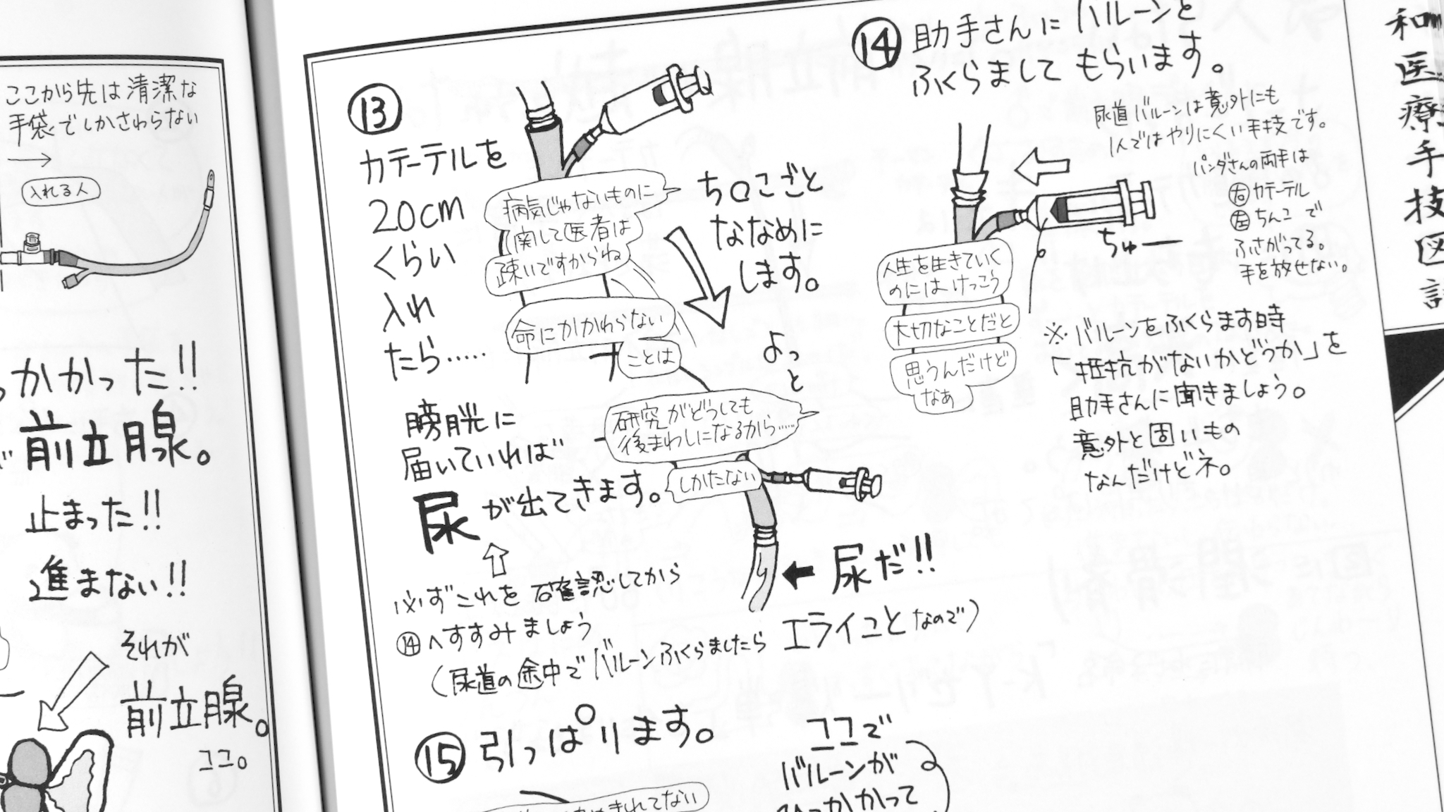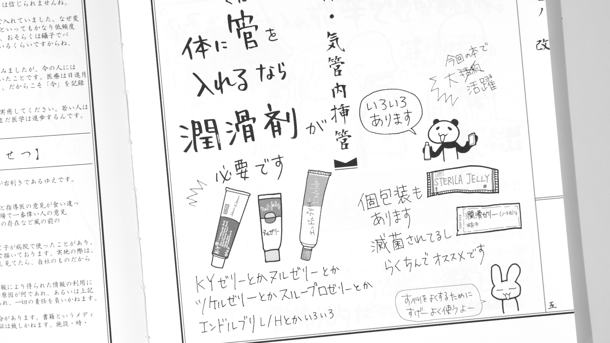 医療関係者用の商業誌ではなく、コミケで販売するミニコミ誌なので、いろいろ規制がある。そのあたりがふきだしになっていて、あれこれかかれている。なんかおもしろい。