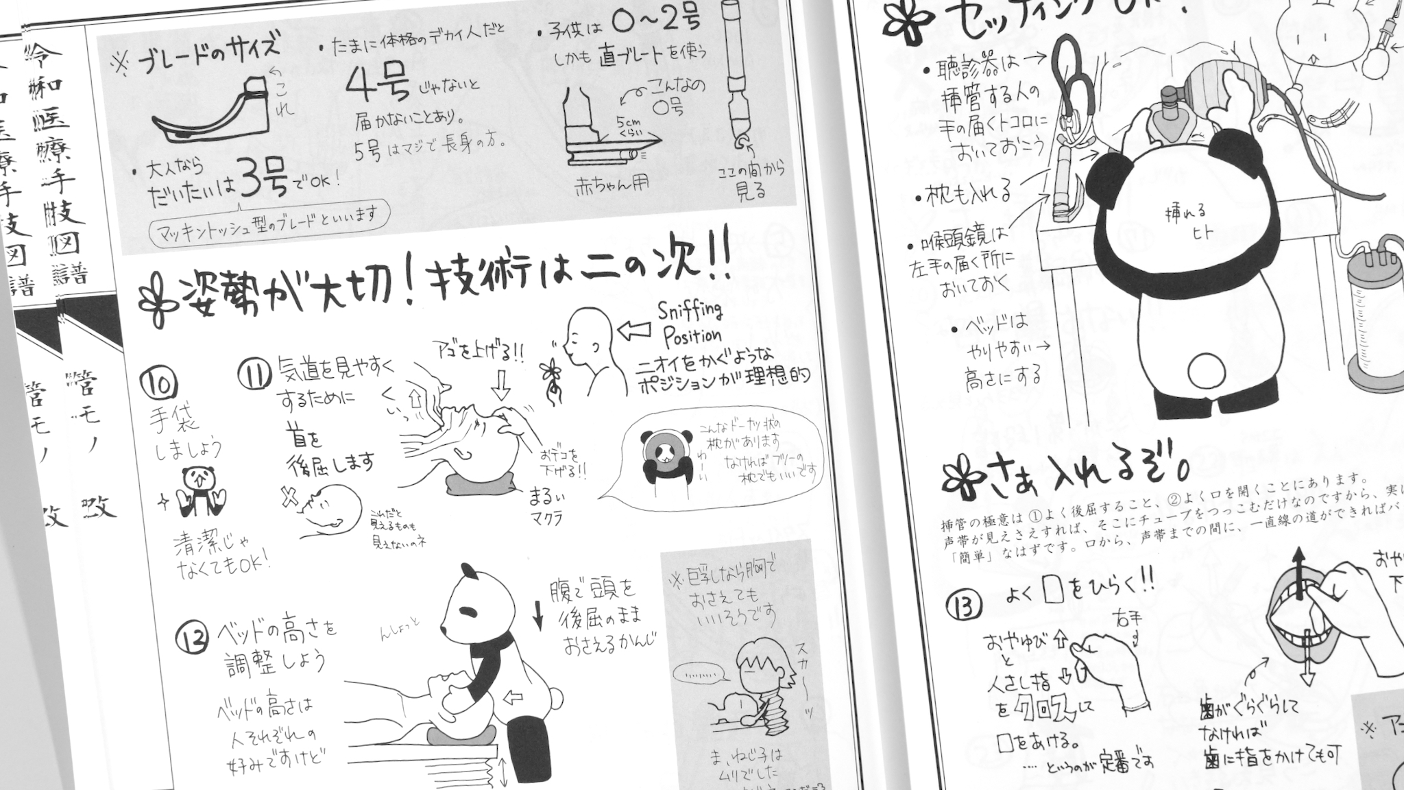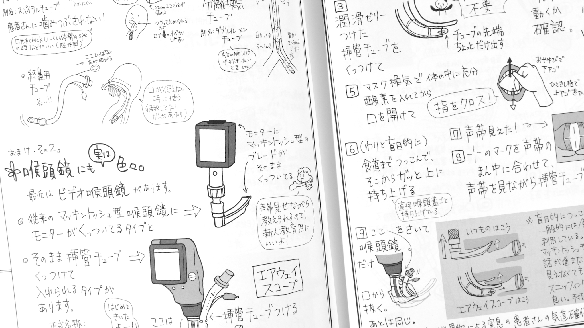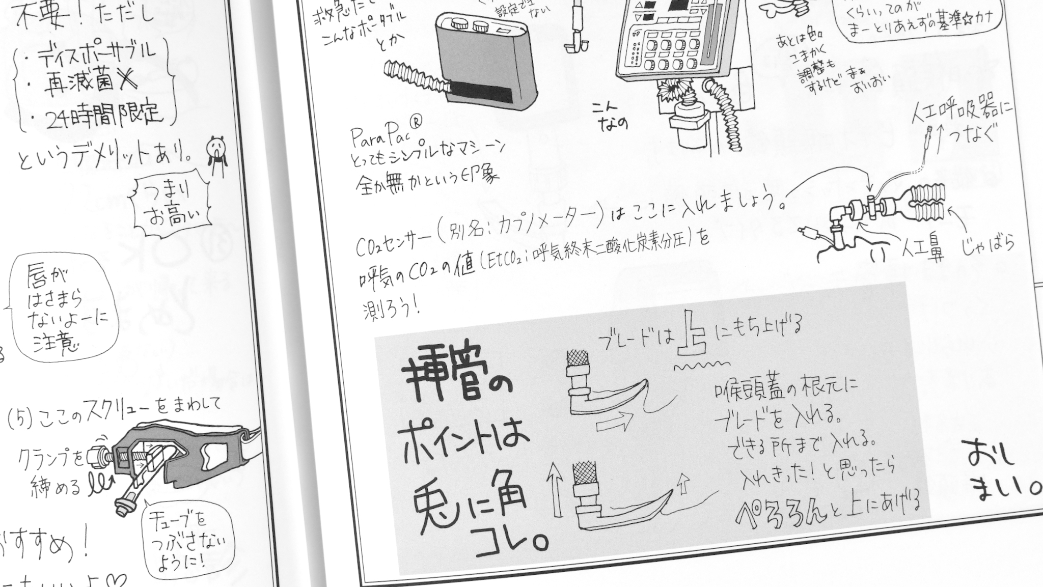 チューブホルダー(左下)、挿管のコツ(喉頭蓋をぺろろんとする)