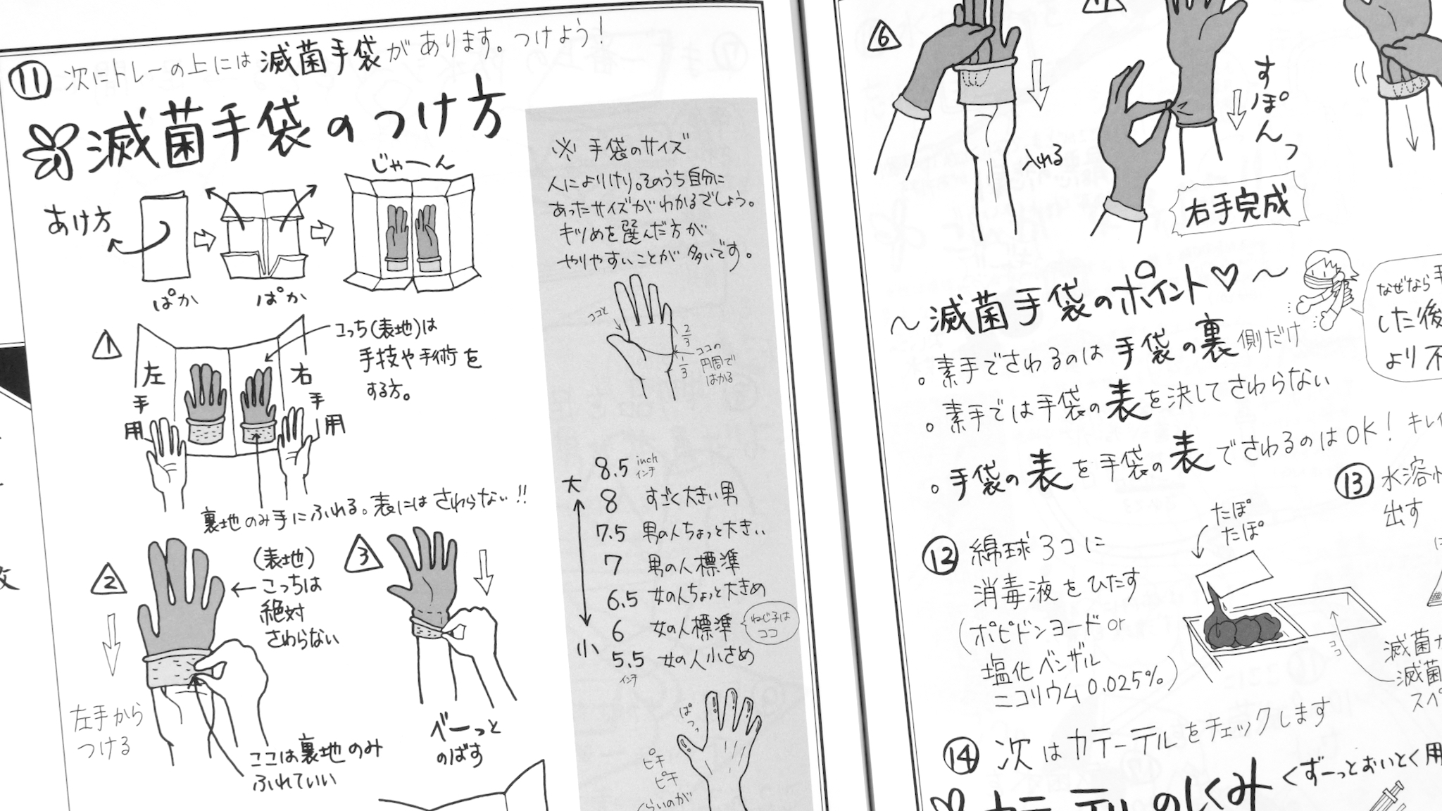 次にありがちなのが、尿道カテーテルの挿入。清潔手技なので、まず手袋の装着から。考えながらやればいいのだけれど、急ぐことも多いので練習が重要だ。