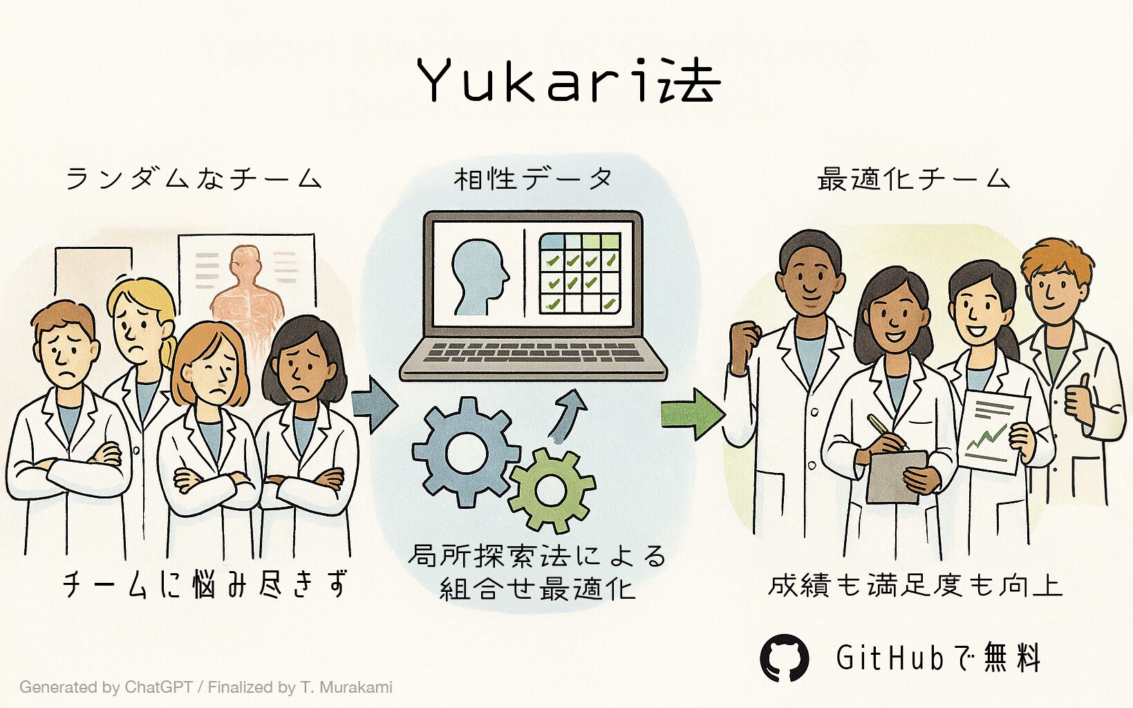 医学教育において、人体解剖実習は基礎となる重要な学習です。これは解剖学の知識を深めるだけでなく、チームワークや専門職としての姿勢を育てる機会にもなります。解剖実習には知的・身体的・感情的に大きな負担が伴うため、チームの協調関係が学習の成否を左右します。私たちは学習効果と成績を向上させるために、解剖実習のチーム編成を自動で最適化する「ゆかり法(Yukari method)」を開発しました。この方法では、安全なウェブアンケートを通じて学生の希望するチームメイトや学習意欲を収集し、ヒューリスティック局所探索アルゴリズムを用いて「相性のよい組み合わせ」を最大化します。ランダム編成や学生自身によるチーム選択と比べて、ゆかり法で編成したチームは学業成績が約10%向上しました。さらに、学生の満足度もランダム編成より有意に高く、自主選択チームとほぼ同等でした。この高い満足度は、より良い成績とも関連していました。これらの結果から、ゆかり法は医学教育において有効であり、工学や社会科学など、他のチーム型学習にも応用できる可能性が示唆されます。(ChatGPTによる日本語訳)
