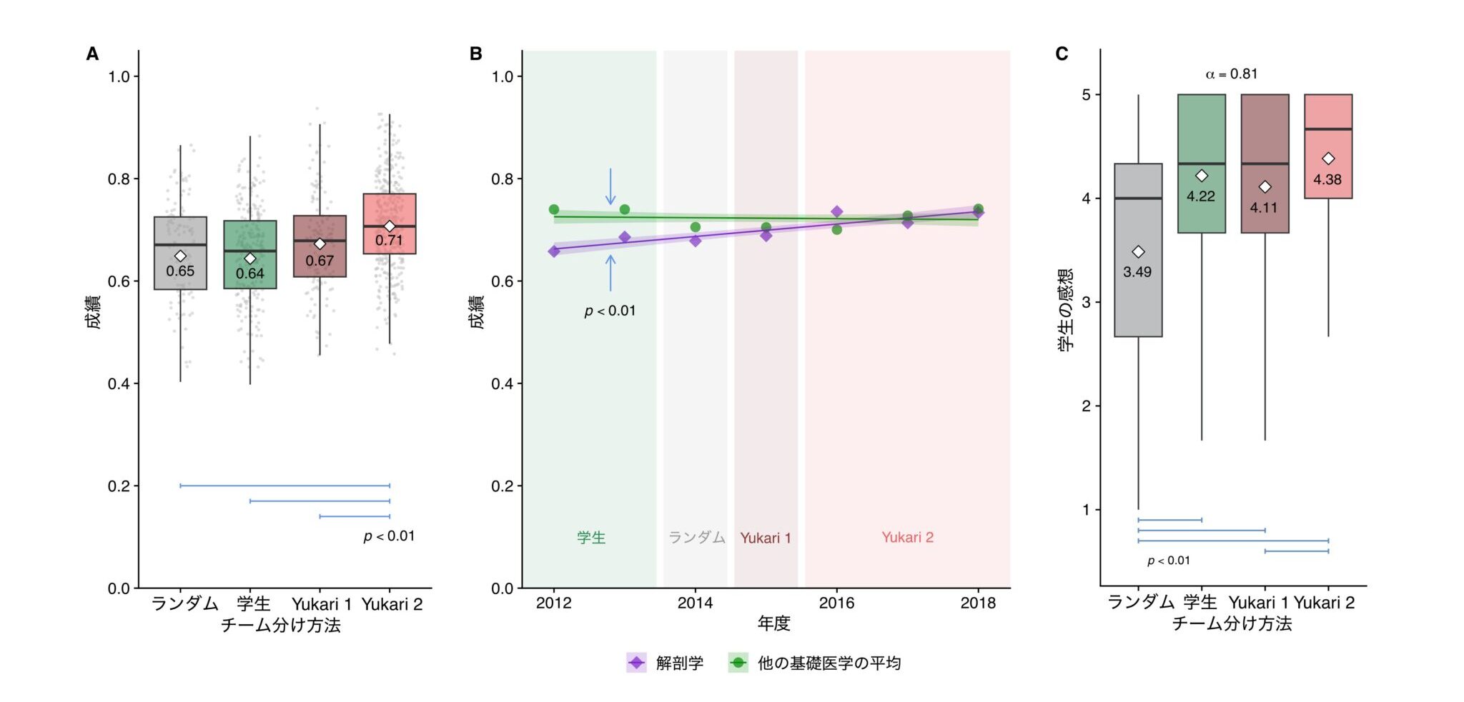 Yukari法による成績とチームへの学生の感想の向上 A. クラス分け方法ごとの成績比較。B. 解剖学とその他の基礎医学の成績の年次推移。C. チーム分けに関する学生の感想の比較。バーは有意差を示す。ランダム:ランダムにチームに割り振る。学生:チーム分けを学生に任せる。Yukari 1:学生同士の希望からマッチングを最適化。Yukari 2:Yukari 1に授業への意欲を加味して最適化