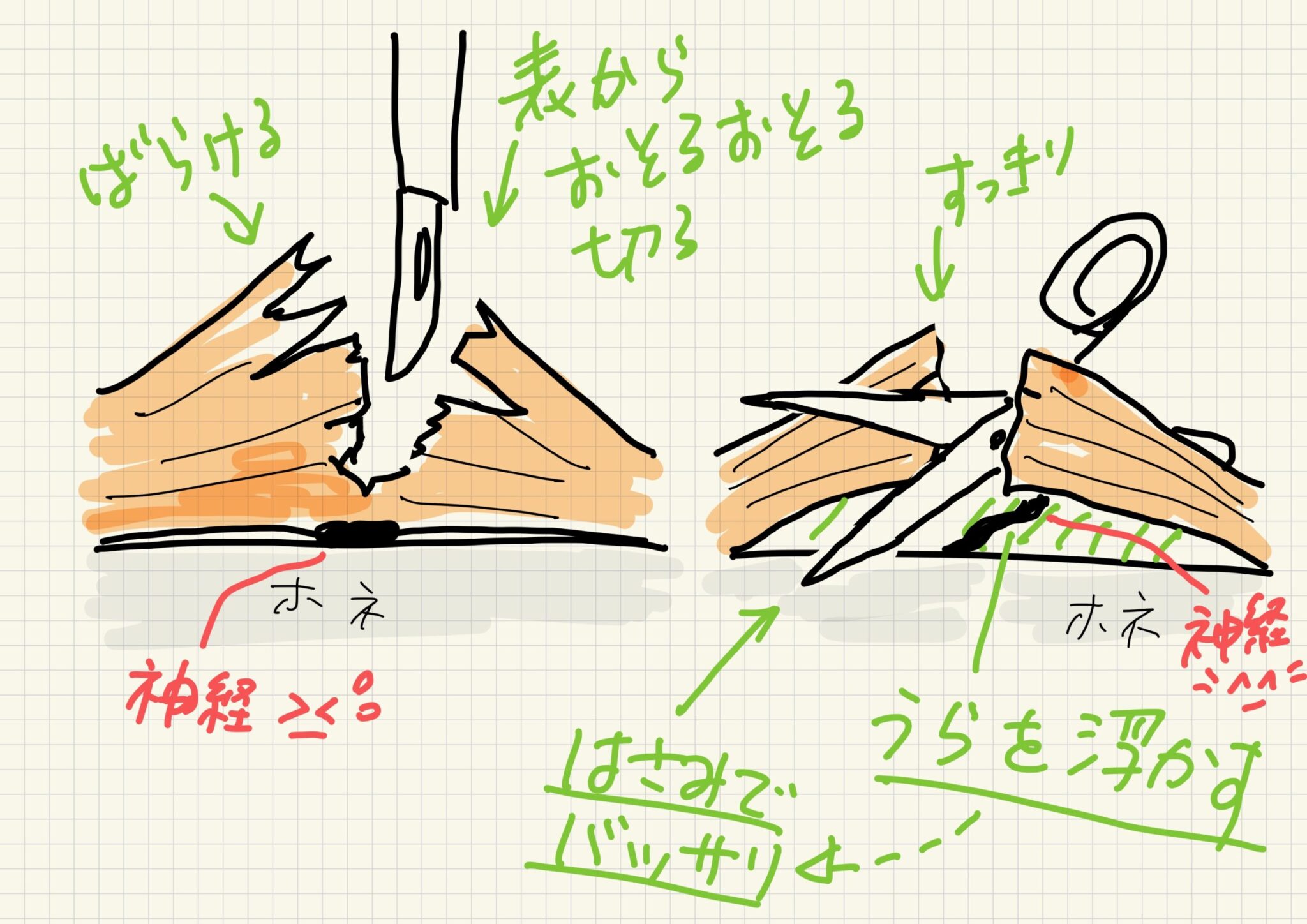筋腹を切るときはハサミで一刀で。それができるように剥離をしっかり。ちまちま切ると切り口がばらつき、始末に負えない。裏側の神経を切ったりもする。