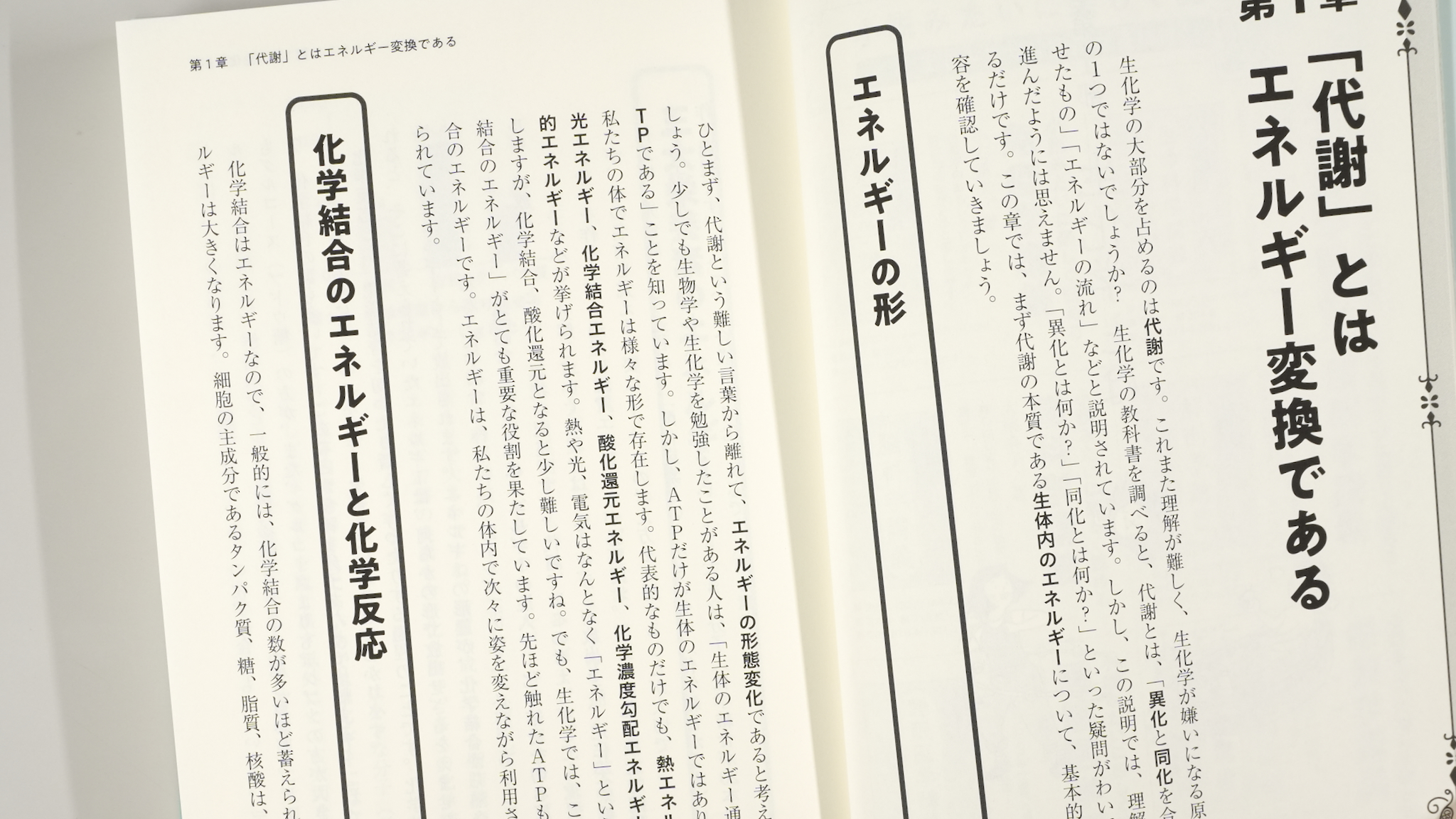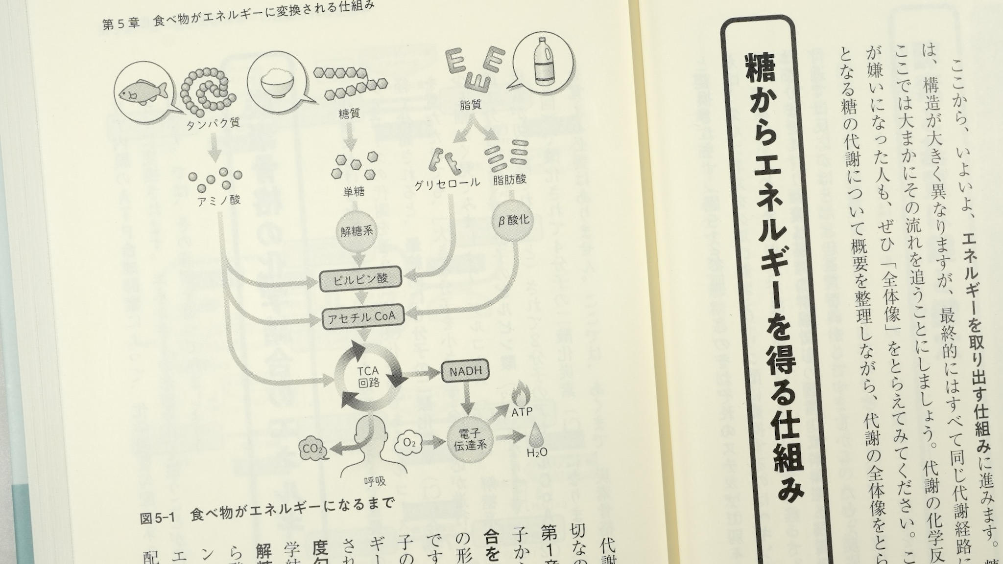 「生命現象を化学構造式や化学反応式で記述する」といってもよくわからないかもなので、本書はまず「代謝」にフォーカスしている。