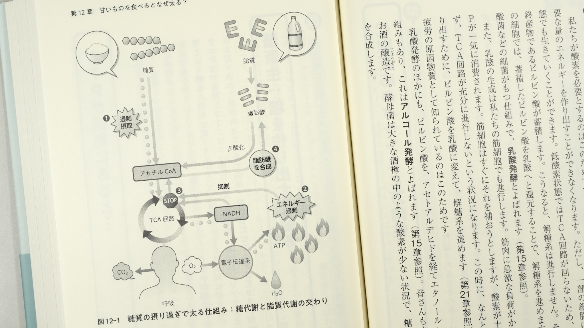 糖質を取り過ぎると太るのはなぜかを、本の前半ででてきたTCA回路を使って説明してあるのはなるほどだった。基礎の応用である。