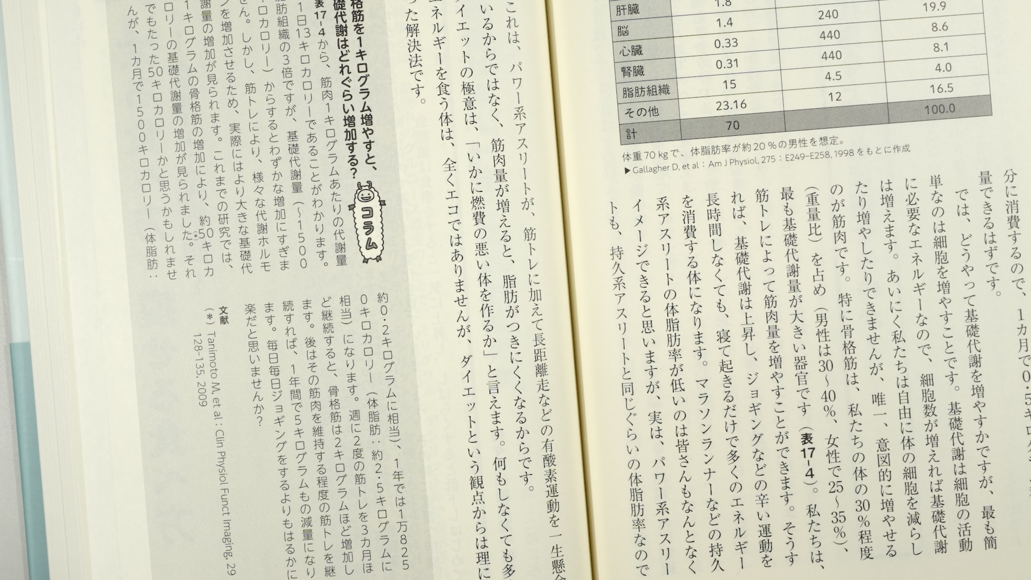 筋肉の基礎代謝量の見積からダイエットにおける筋トレの意義を根拠づける。羊土社の筋トレさんたちが僥倖に胸筋を震わせたに違いない。