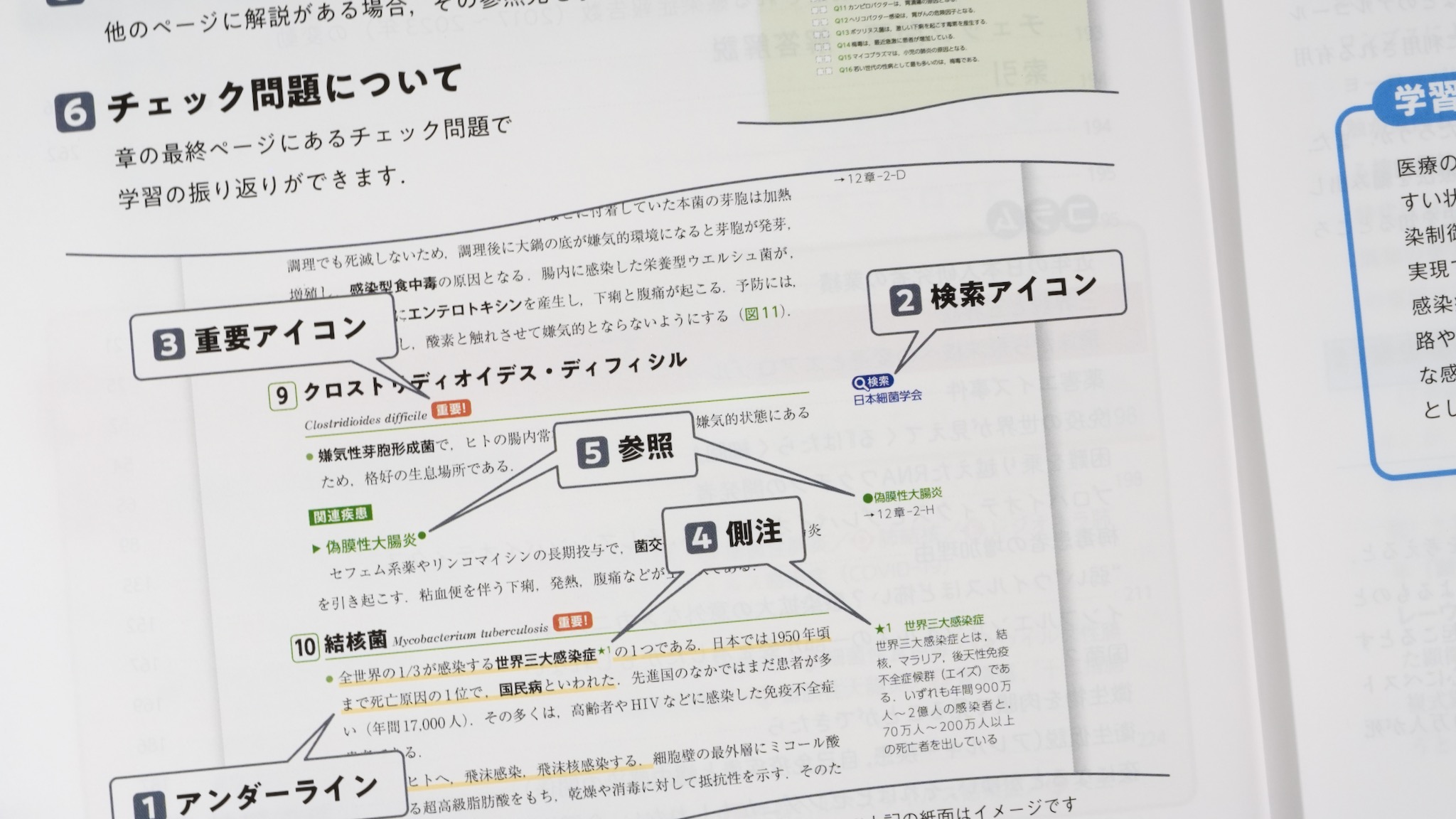 院内感染症で重要になる病原体には 重要! アイコンがある。注釈は ★側注 (注)としてすぐ横にあり、ググったときにちゃんとした情報を選べるよう 検索 アイコンがある。詳しい説明が他のベージにあるときには ●参照 で示される。