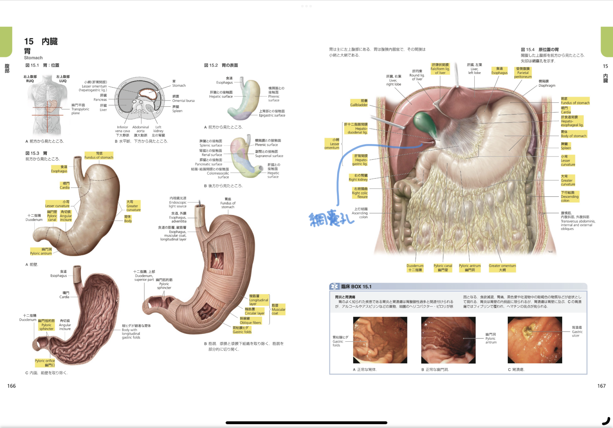 eLibrary版『グレイ解剖学』にマーカー(緑)を引き、描き込み(黒)をした