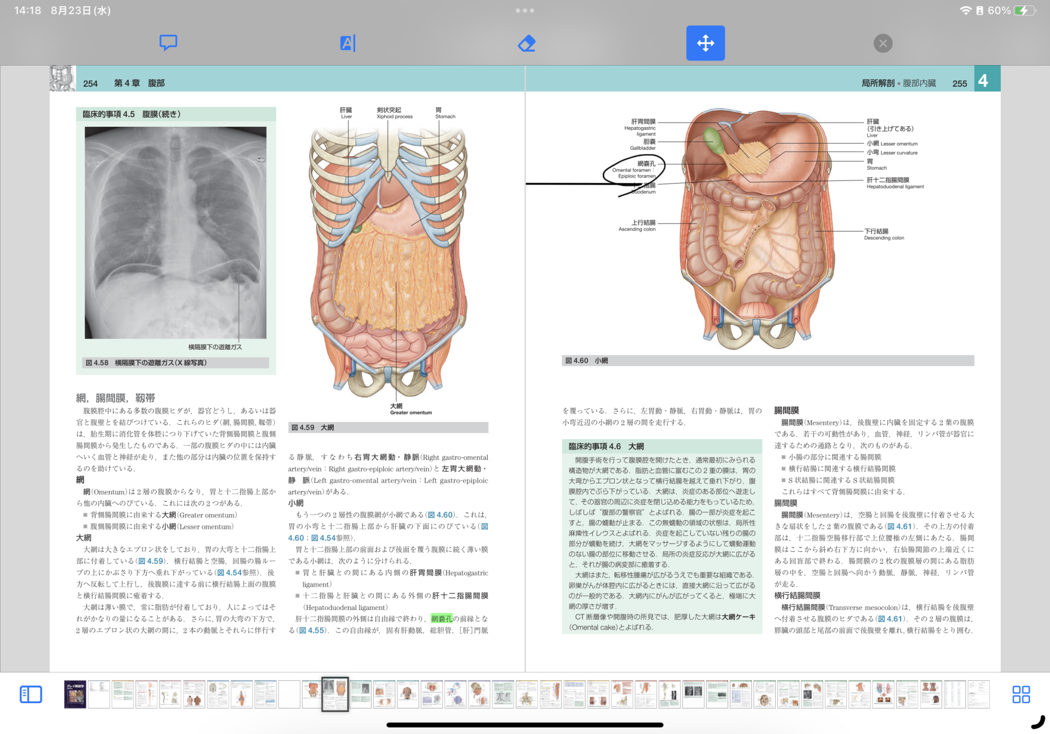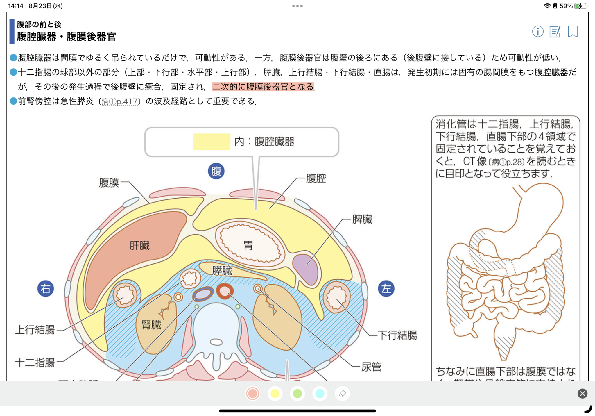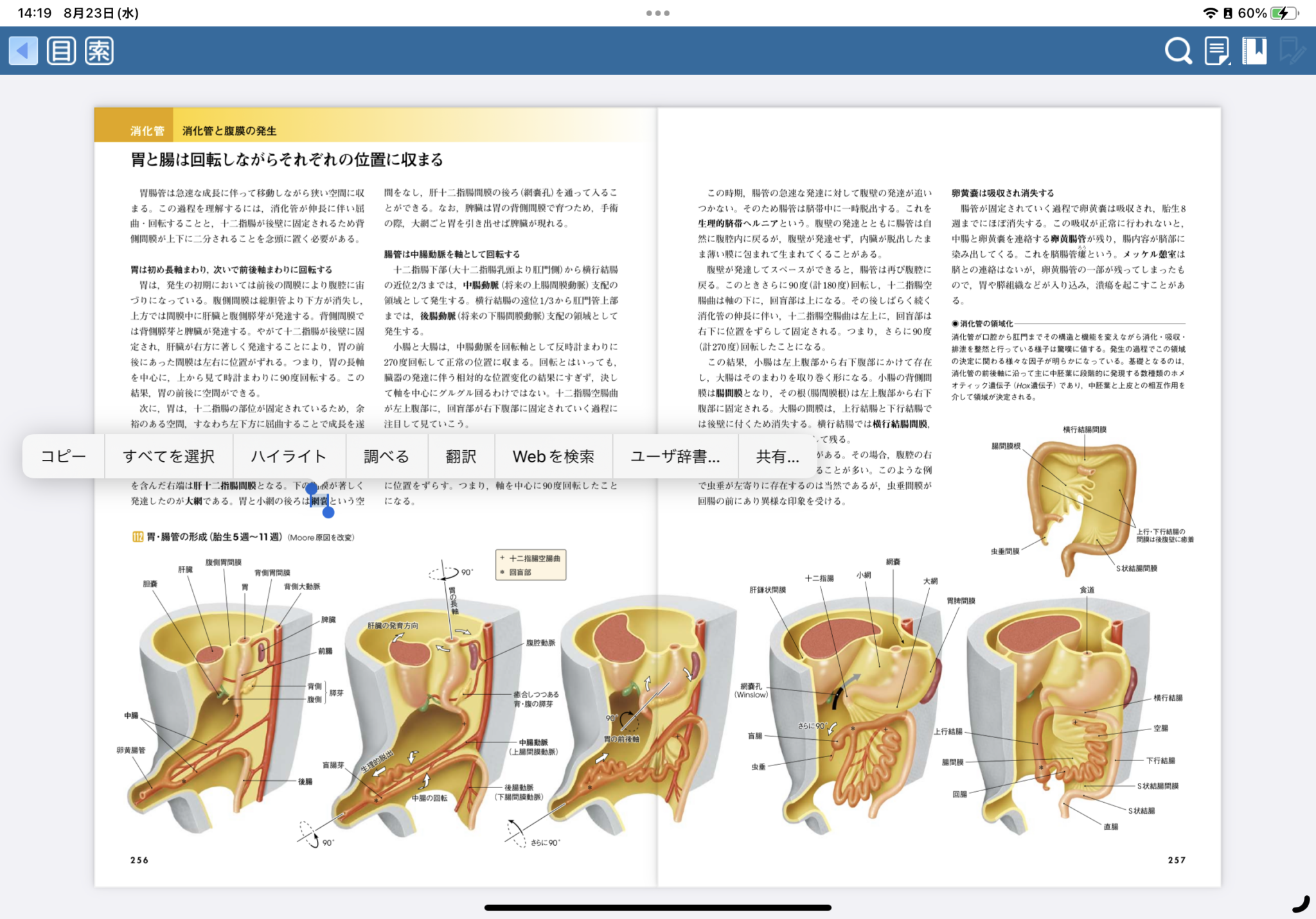 M2PLUSにも書籍のフォーマットが複数あるけれども、解剖学のテキストはPDF。紙面のままの表示で、マーカーを引いたり描き込みしたりできる。南山堂医学大事典などへのリンクが自動的に表示される(リンク先を見るには別途購入が必要)。