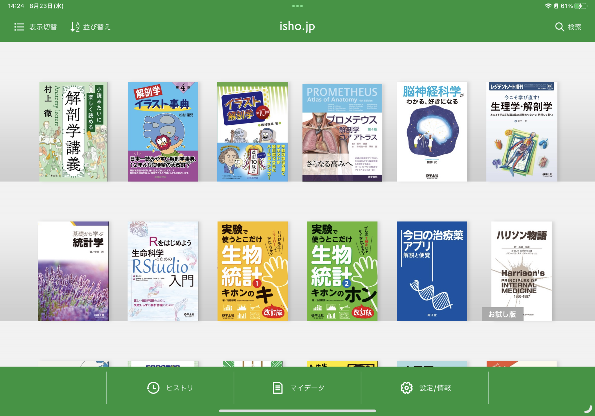 M2PLUSは、医学書専門の電子書籍のプラットフォーム。冊子体の紙面のままの電子書籍と、リフロー型のとがある。後者には使いにくいのもあるので、立ち読み機能で内容確認したい。